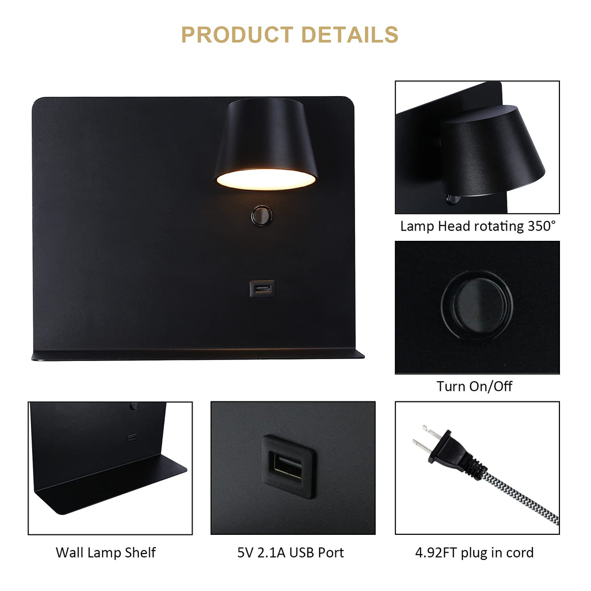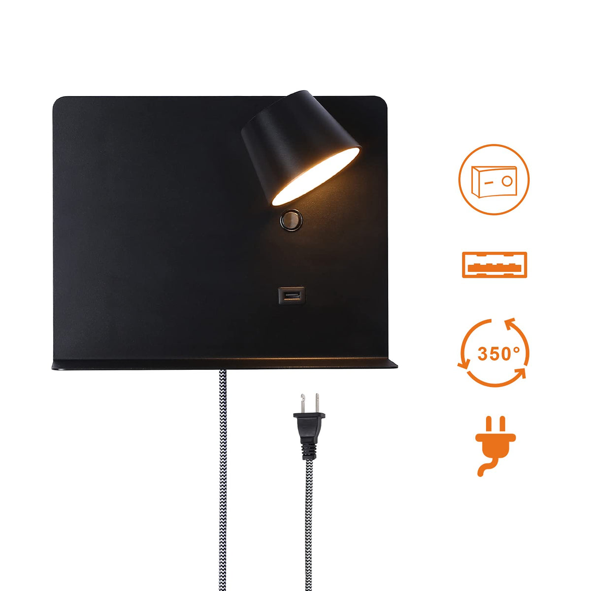 Plug In Cord Wall Sconce With Usb Port Charging, Led Wall Lamp With Shelf Lights Fixture Reading Lights For Bedside Rotation Wal