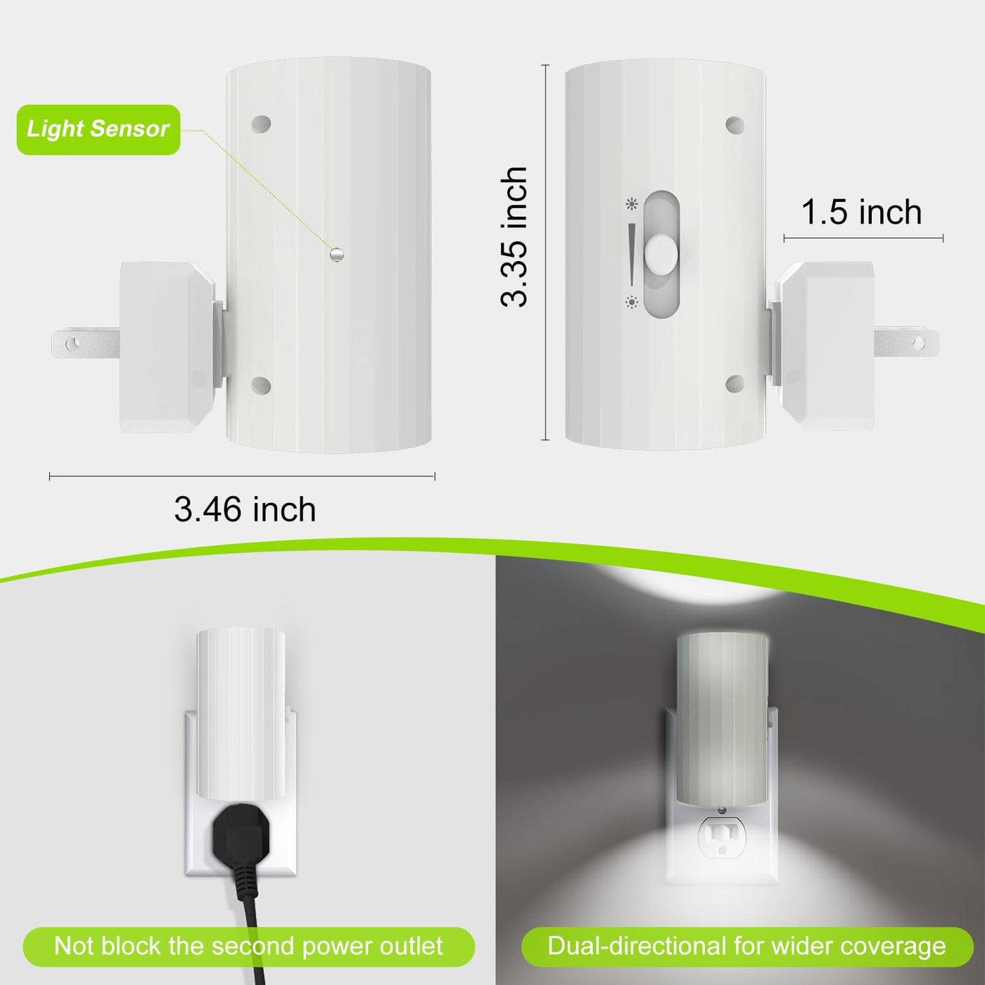 Q: How does the dusk to dawn sensor work in the night light?A: The dusk to dawn sensor in the night light automatically detects ambient light levels, turning the light on at night when it gets dark and off during the day when it is bright. This feature helps save energy while ensuring that your space is illuminated when needed.