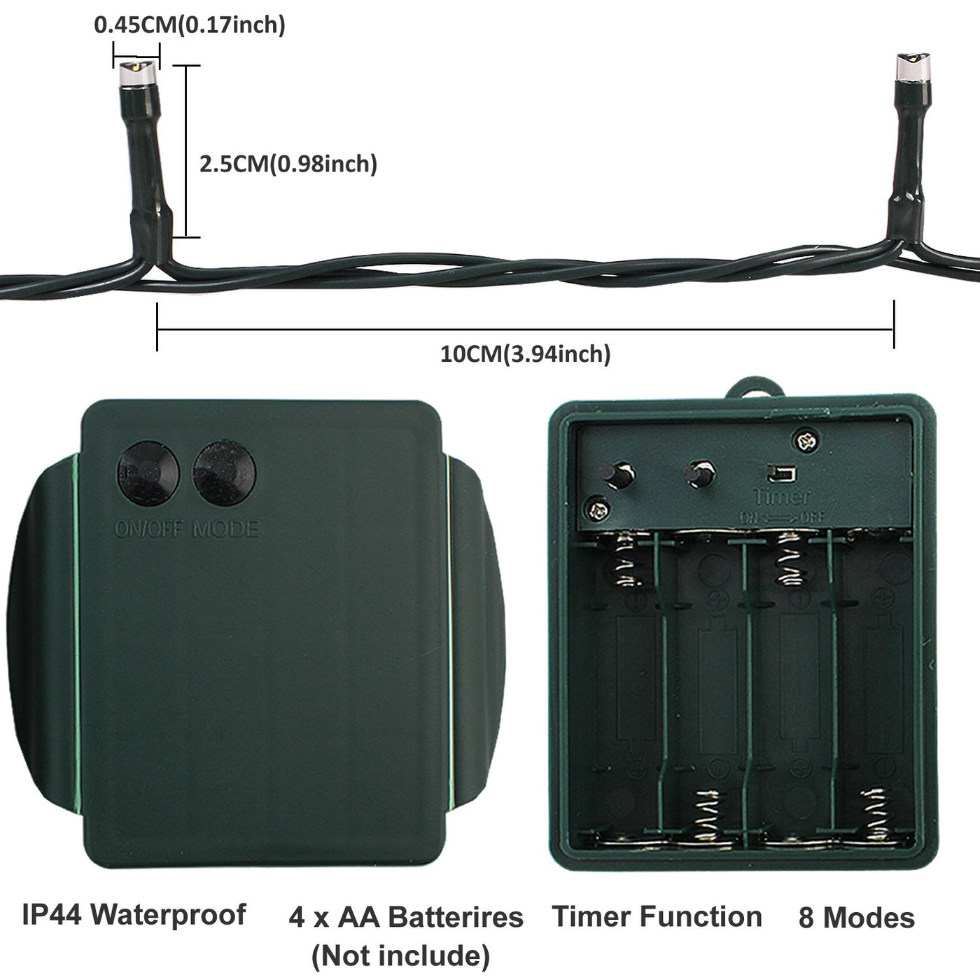 Specification : LED No.: 100 LEDs Light colors: Warm White Total Cable Length: 11.5m (37.7ft) Length between Led bulbs: 0.1m Lead Cable: 1.5M (4.9ft) Cable Color: Dark Green Battery Pack Color: Green