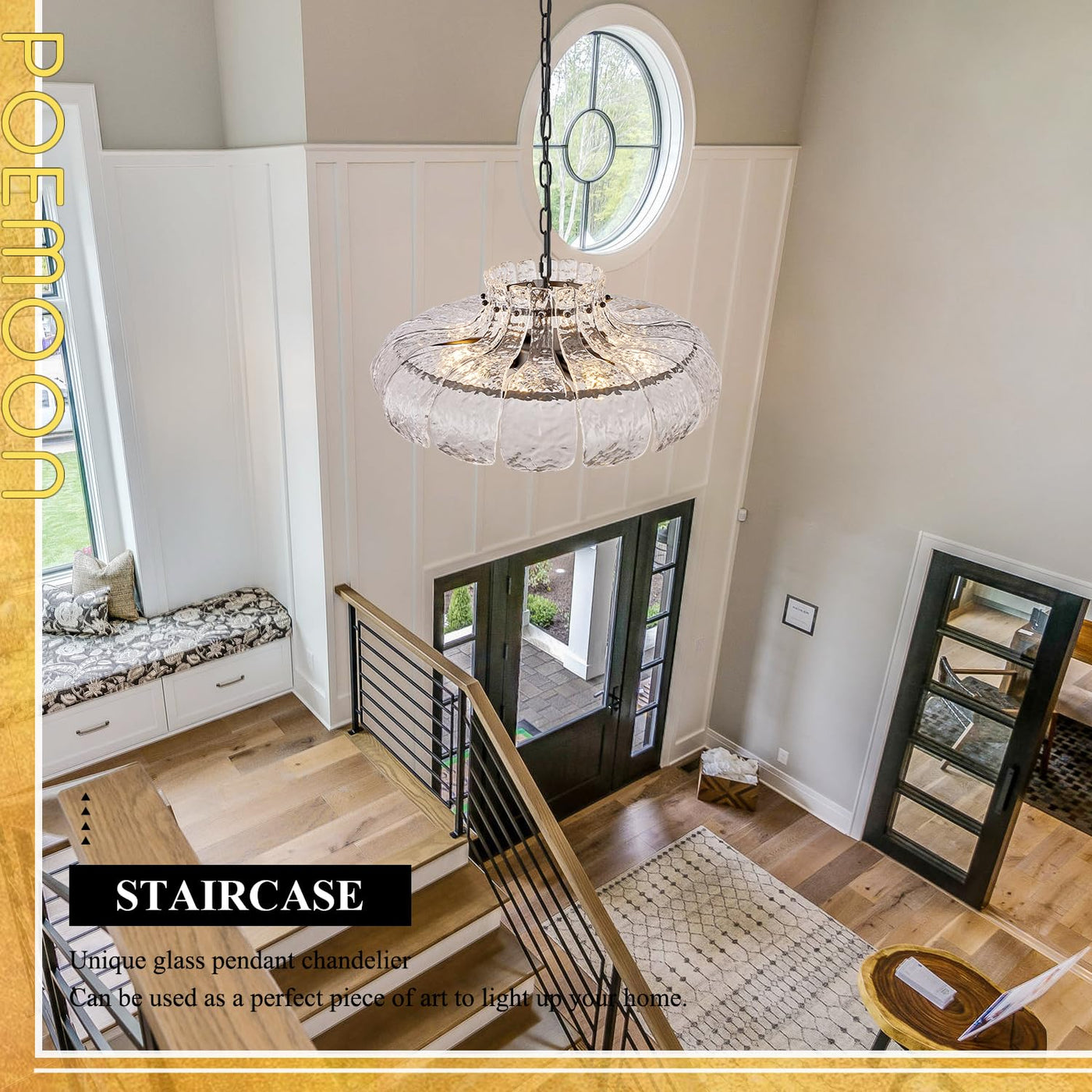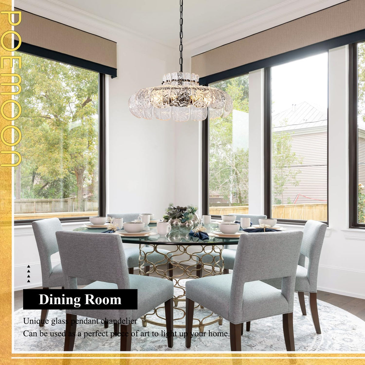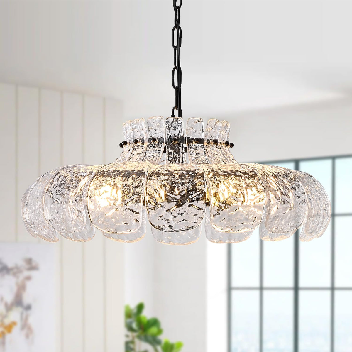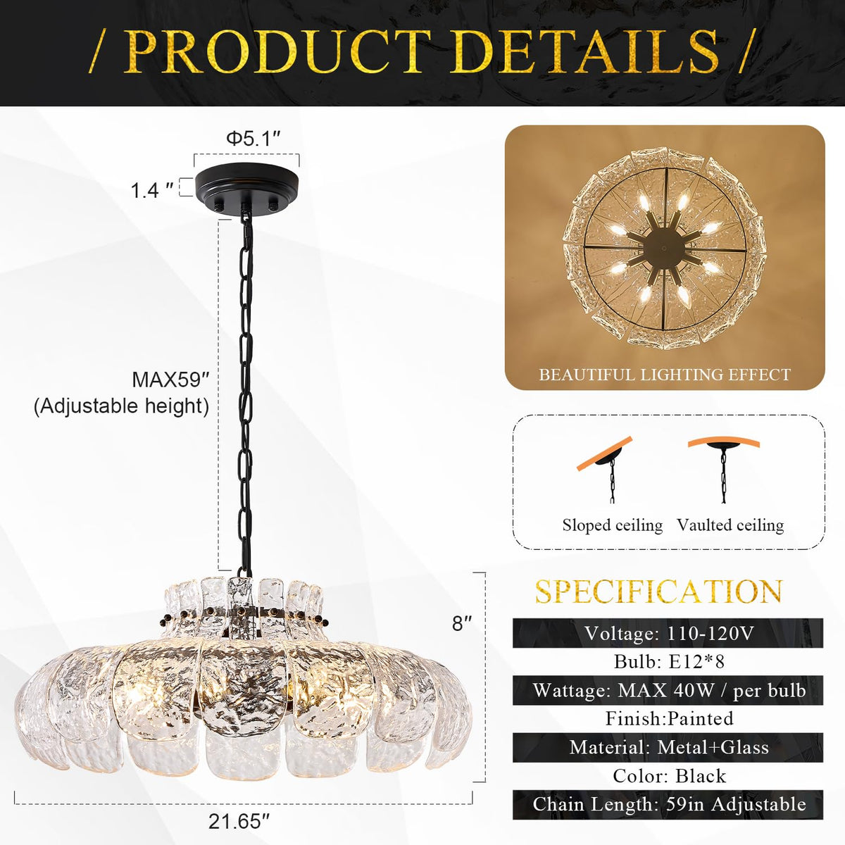 Poemoon Black Glass Chandelier 8-Light Luxury Water Ripple Glass Chandelier Lighting 21.6'' Modern Hanging Light Fixture for Living Dining Room,Kitchen,Foyer,Entryway,Bedroom,E12 Base