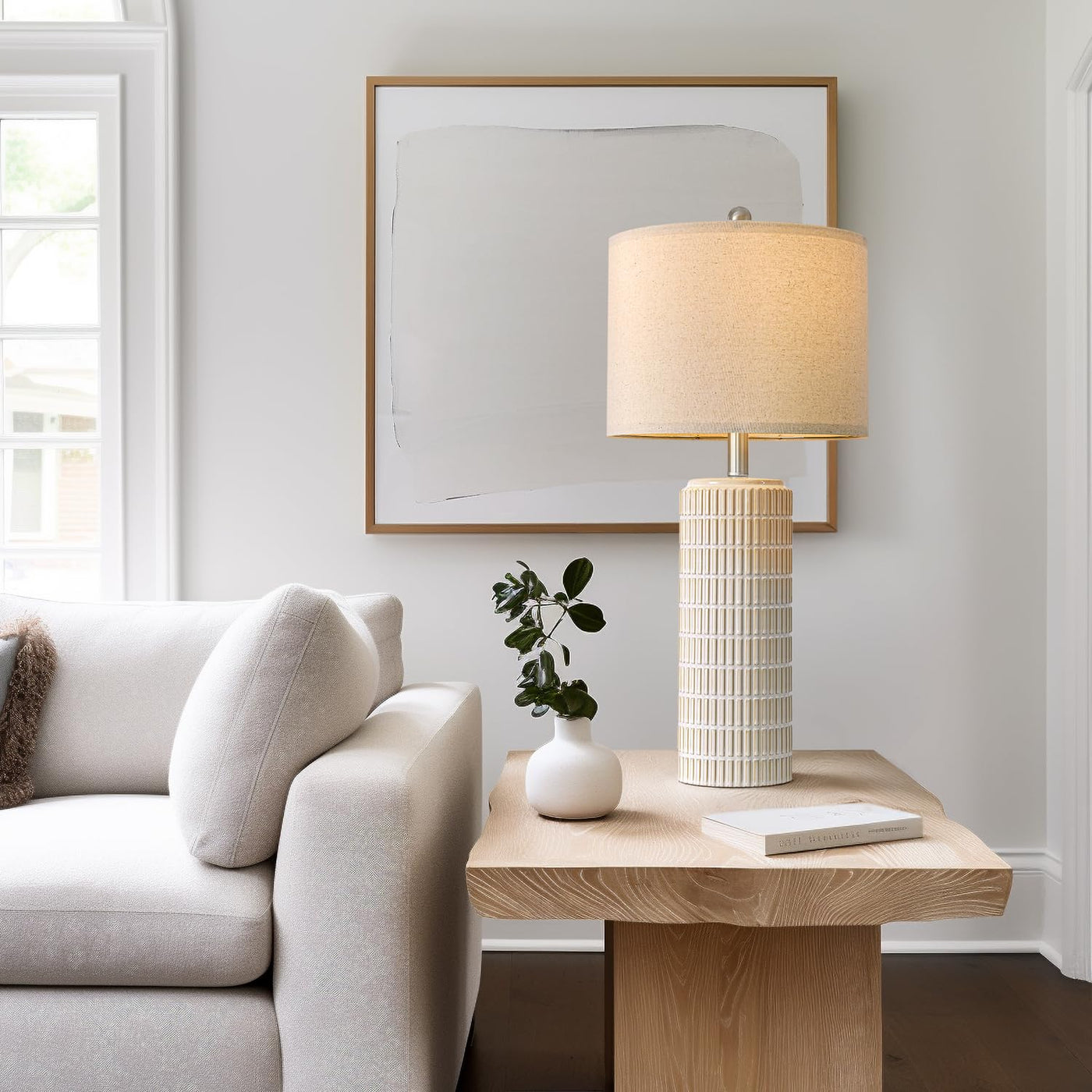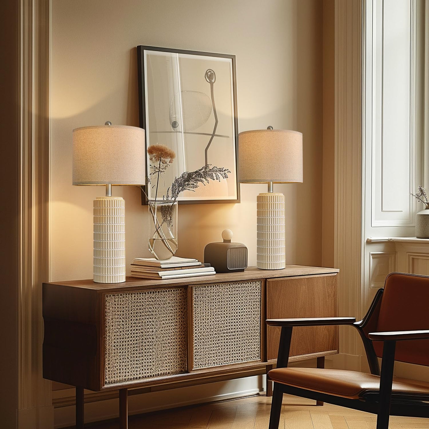 Q: What materials are used in the construction of these lamps?A: The lamps feature a high-quality ceramic base and a handcrafted linen shade, offering both durability and an elegant aesthetic suitable for modern and farmhouse-style interiors.