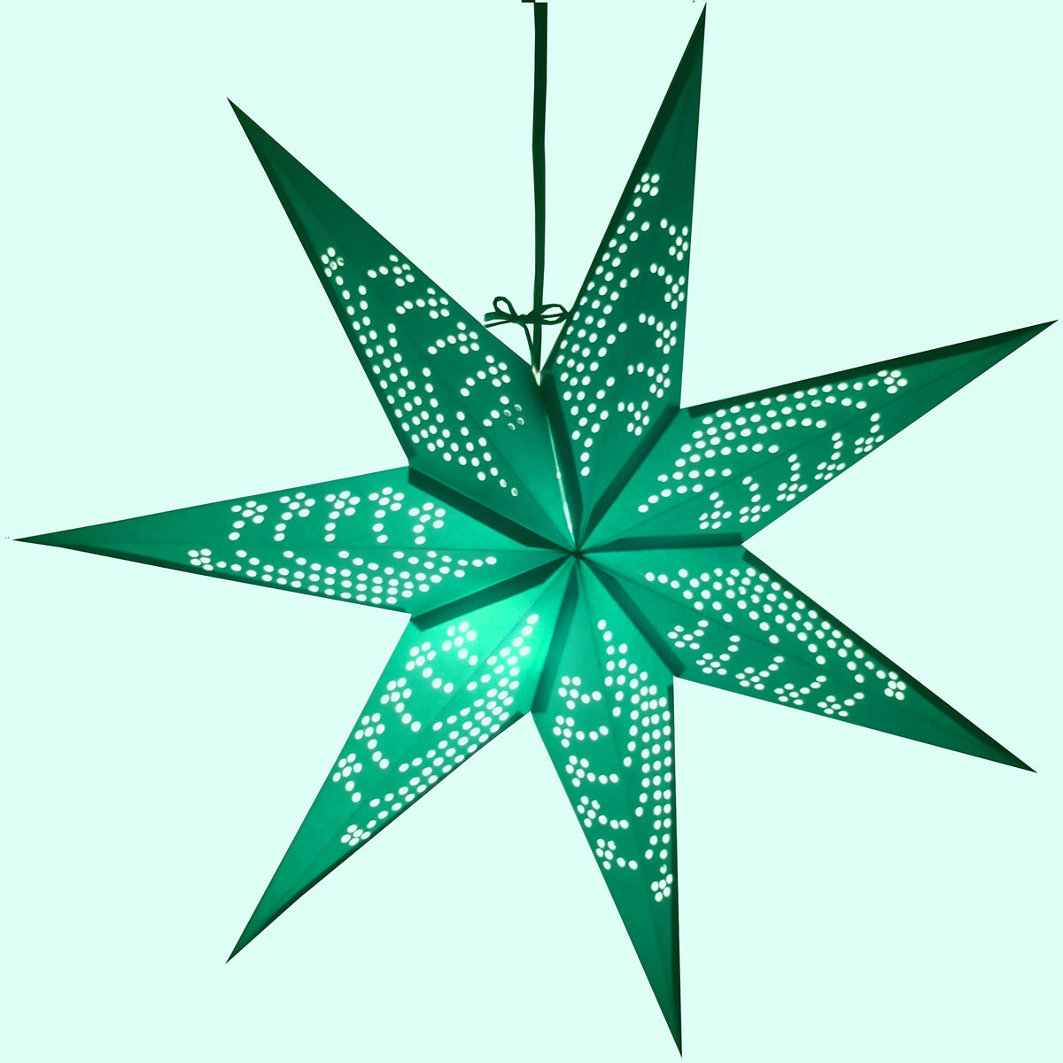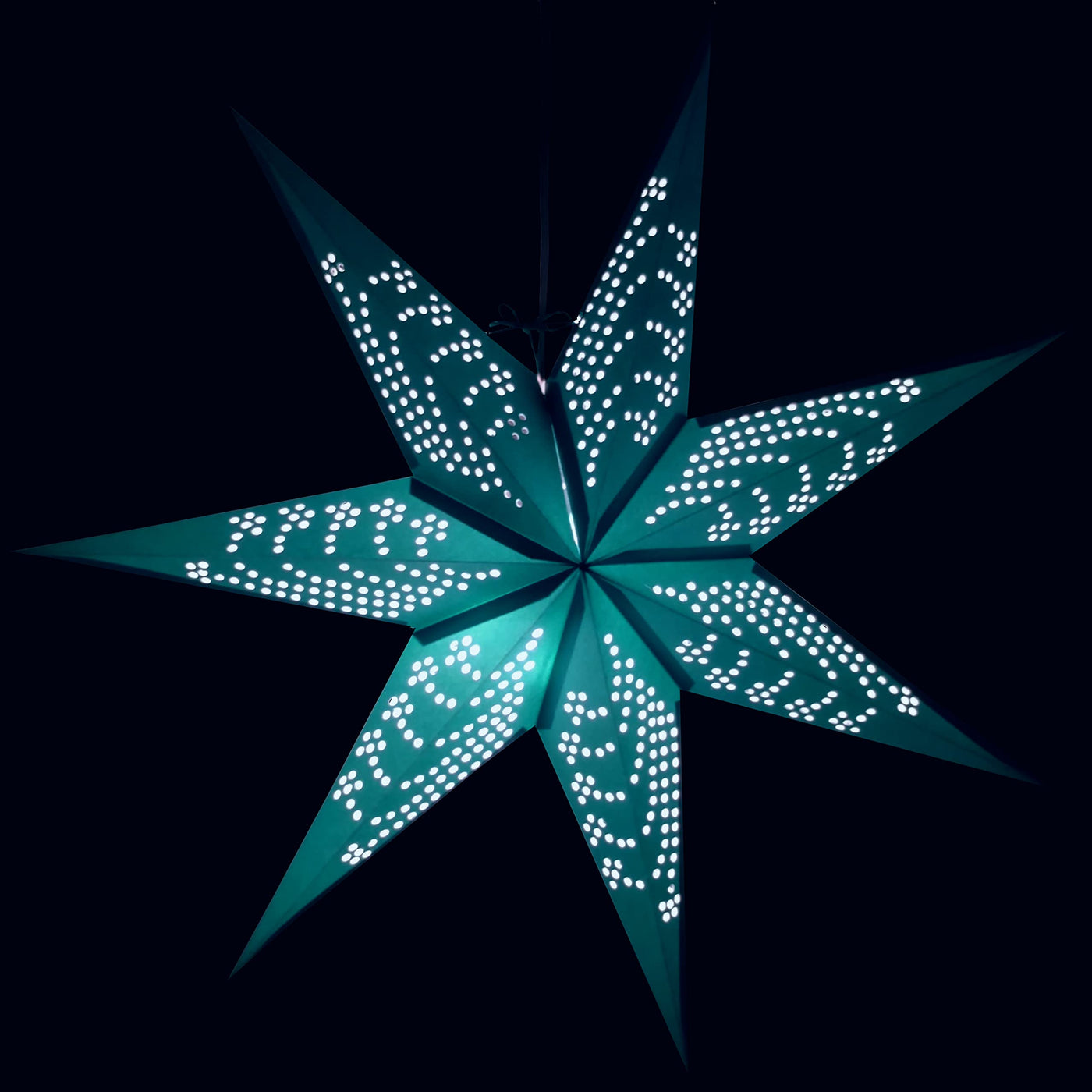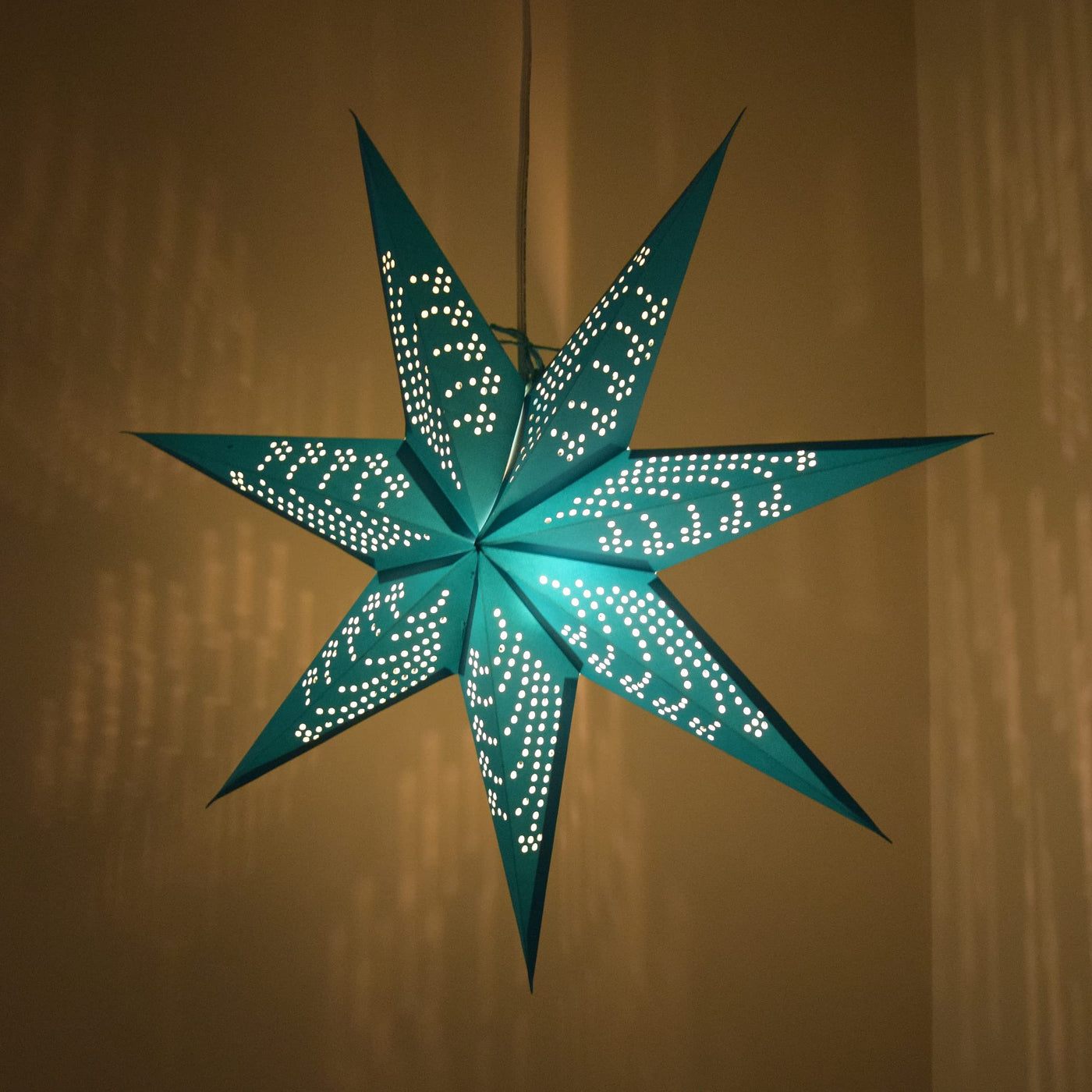Take the stars from the night sky into your home! Add unique illumination with our decorative paper star lights. We have over 70 styles of paper star lamps perfect for any occasion including Christmas and Diwali. Suspend a couple of paper star lights from your living room ceiling and admire the glimmer of little lights cast on the walls. Dangle a paper star lantern in your favorite window and it will appear to fall from the sky. Paper lampshades make great home decorations. Specifications This This seven pointed paper star light features a turquoise background with bursts of circular cut outs.White 12 foot standard power cord with on/off switch included Paper star lights are shipped flat with clear instructions for easy assembly The folded paper light expands into a 3 dimensional star Assembled star is 24 inches wide by 7 inches deep All of our paper star lights are handmade in India and are eco-friendly Lights safely accept up to a 40 watt standard light bulb Going green? Substitute an energy saving LED bulb for a standard bulb Over 70 unique styles available Genuine Hometown Evolution, Inc. Product