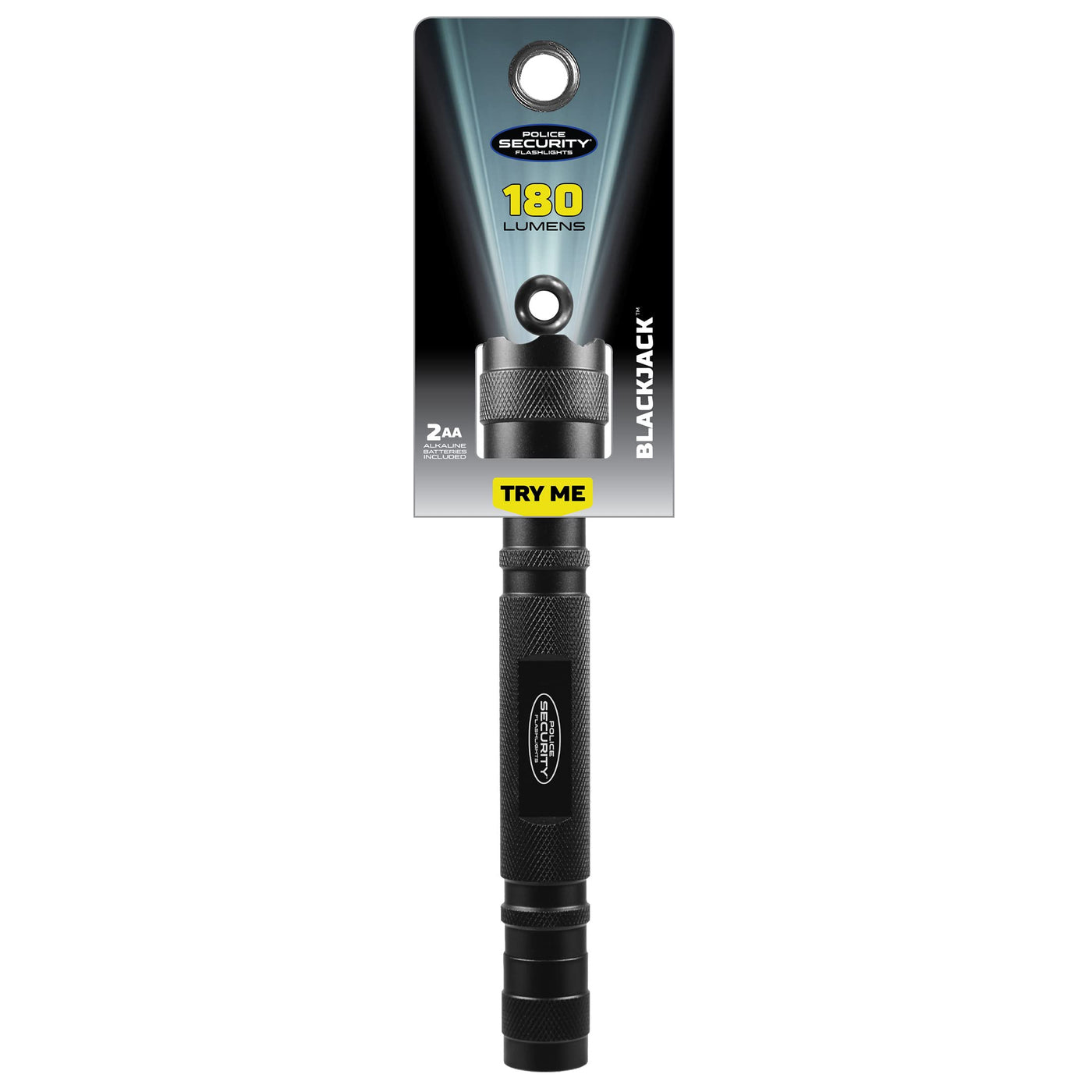 Police Security’s Blackjack runs on two AA batteries and delivers 180 lumens. With a 100 meter reach and a total run time of two hours, the Blackjack is a reliable flashlight for everyday use.