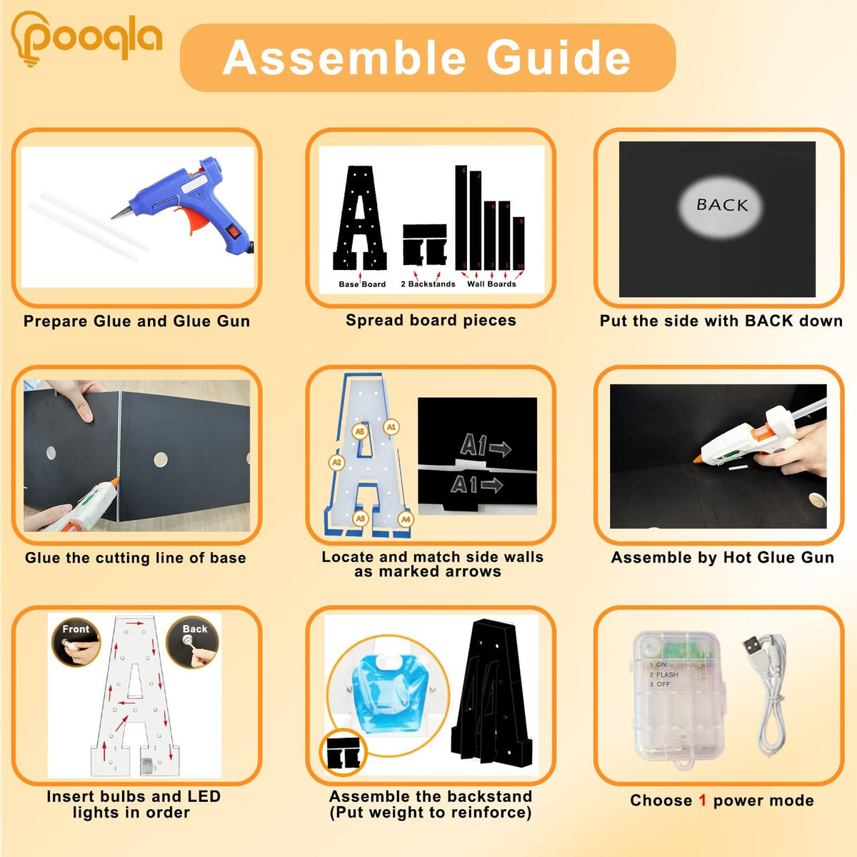 Q: How do I assemble the Pooqla 4 FT Marquee Light Up Letters?A: Assembling the Pooqla Marquee Light Up Letters is easy. Start by gluing the base board, then match the base and wall boards according to the marked numbers and arrows. Next, glue the base and wall boards together, screw in the bulbs, connect the LED lights, and power on. A glue gun and glue are not included.