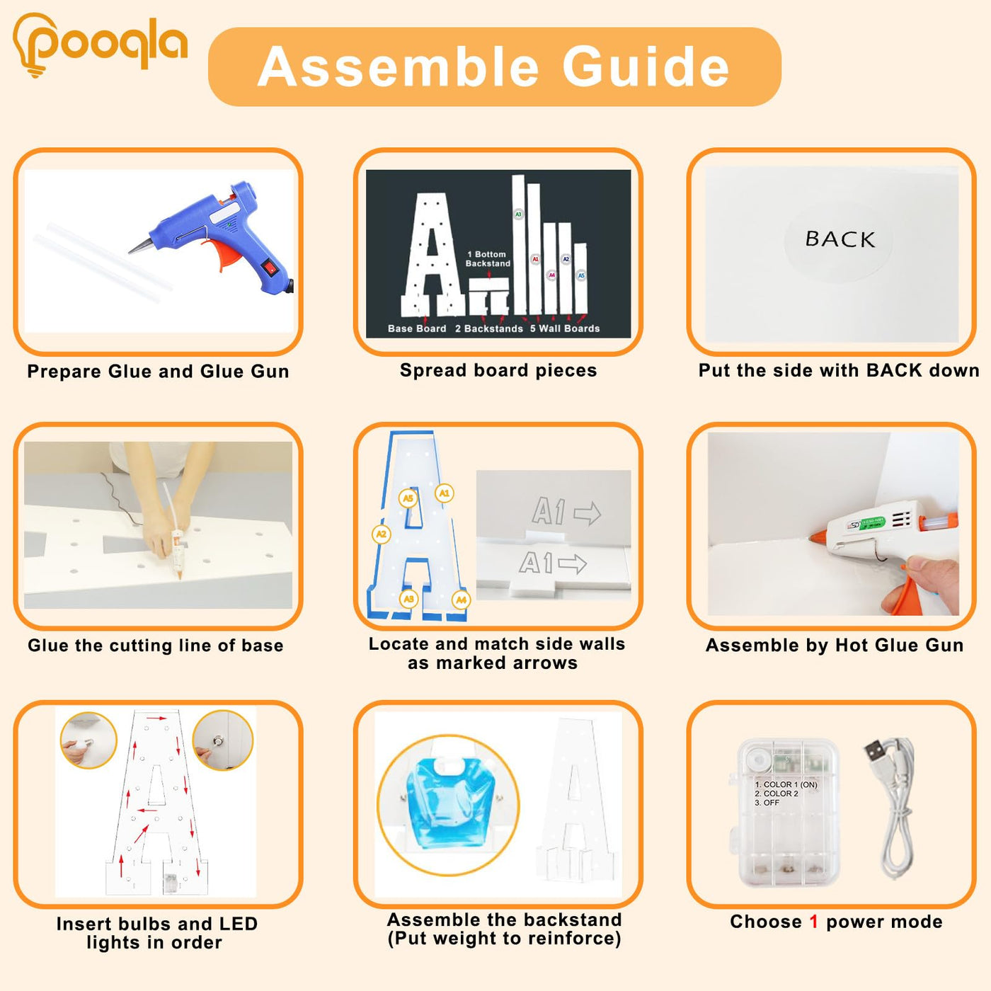 Q: Is the marquee letter easy to assemble?A: Yes, the marquee letter is designed for easy assembly. Simply glue the base board, match the wall boards according to the marked numbers, screw in the bulbs, and connect the LED lights.