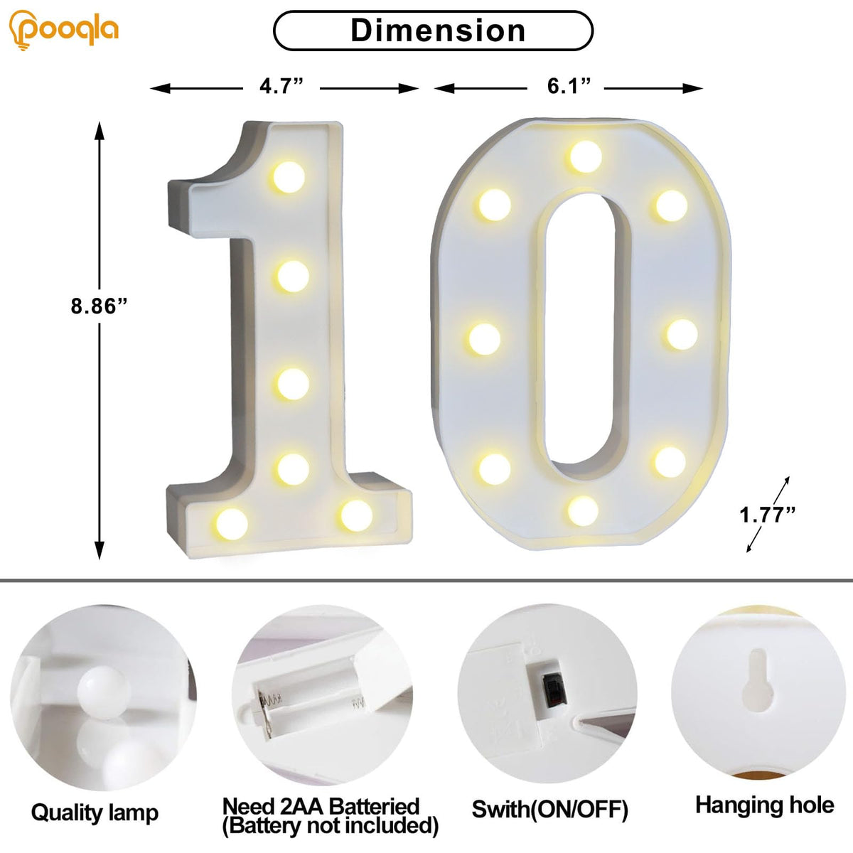 Pooqla Decorative Led Light Up Number Letters, White Plastic Marquee Number Lights Sign For 10Th Birthday Party Wedding Decor Battery Operated Number (10)