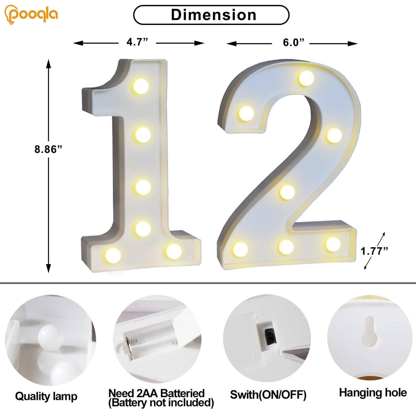 Q: What are the dimensions of the Pooqla Decorative LED Light Up Number 12?A: The Pooqla Decorative LED Light Up Number 12 measures 8.86 inches in height and 1.77 inches in thickness, making it an appropriate size for various decorations.