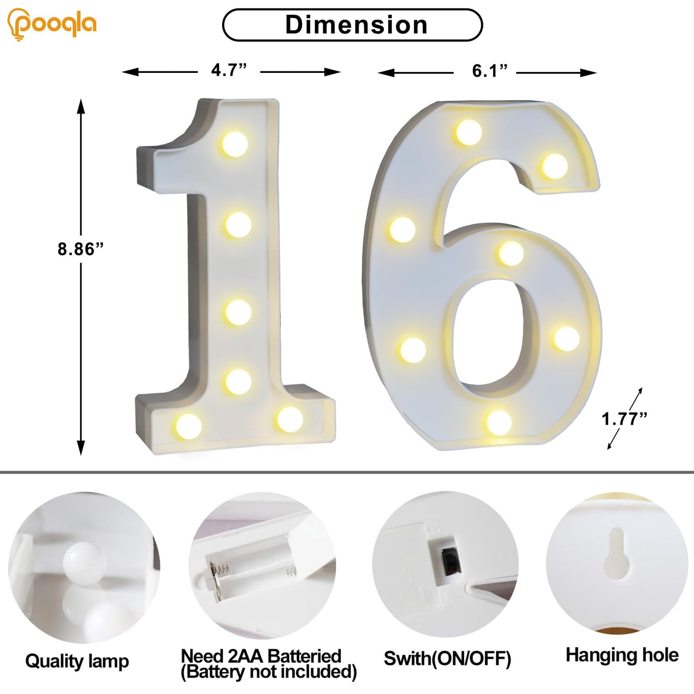 Pooqla Decorative Led Light Up Number Letters, White Plastic Marquee Number Lights Sign For 16Th Birthday Party Wedding Decor Battery Operated Number (16)