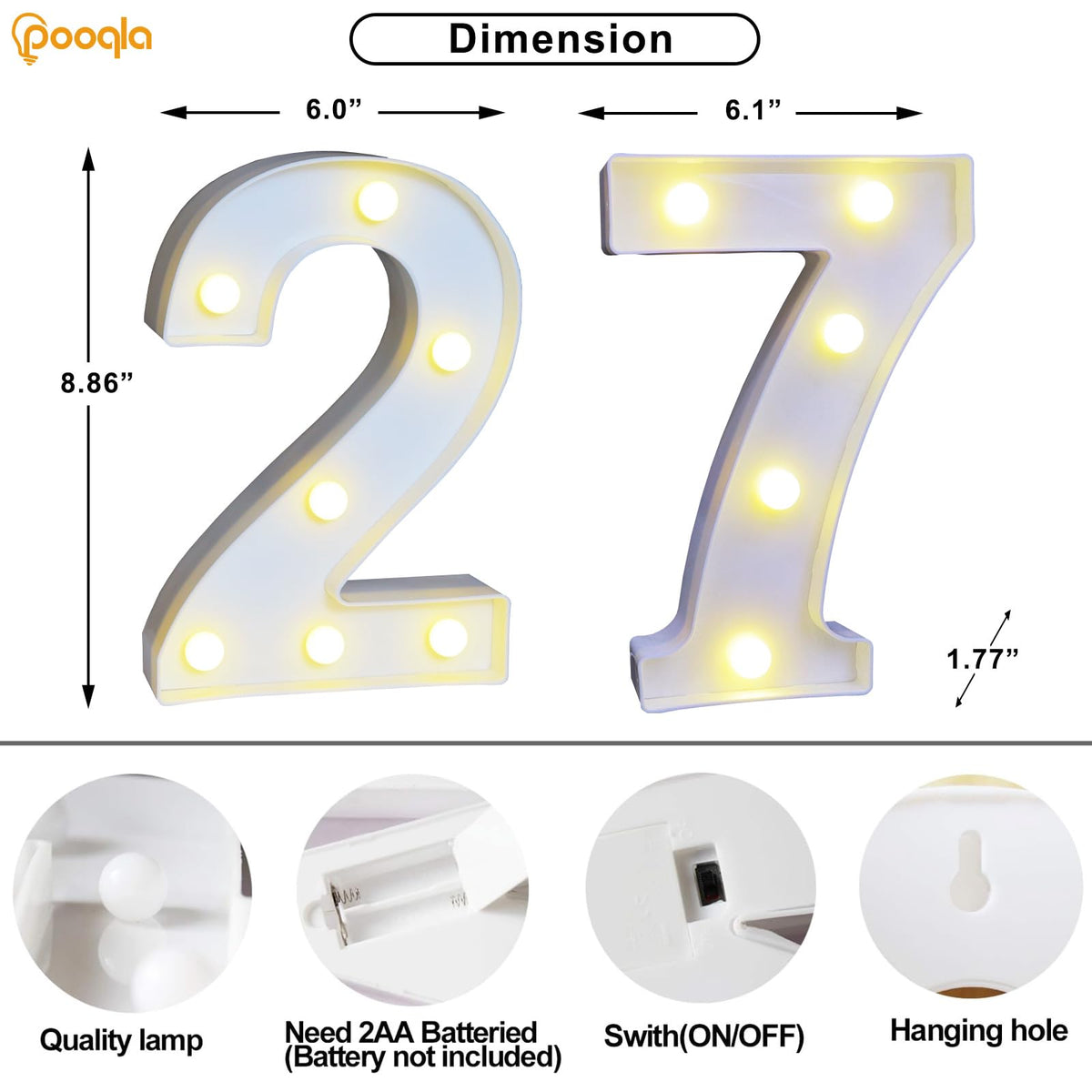 Q: What are the dimensions of the Pooqla Decorative LED Number Lights?A: The Pooqla Decorative LED Number Lights measure 8.86 inches in height and 1.77 inches in thickness, making them a reasonable size for both tabletop and wall decorations.