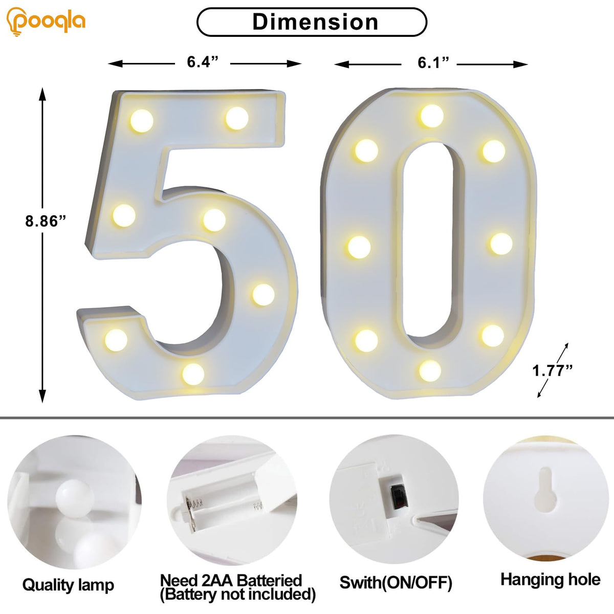 Pooqla Decorative Led Light Up Number Letters, White Plastic Marquee Number Lights Sign For 50Th Birthday Party Wedding Decor Battery Operated Number (50)