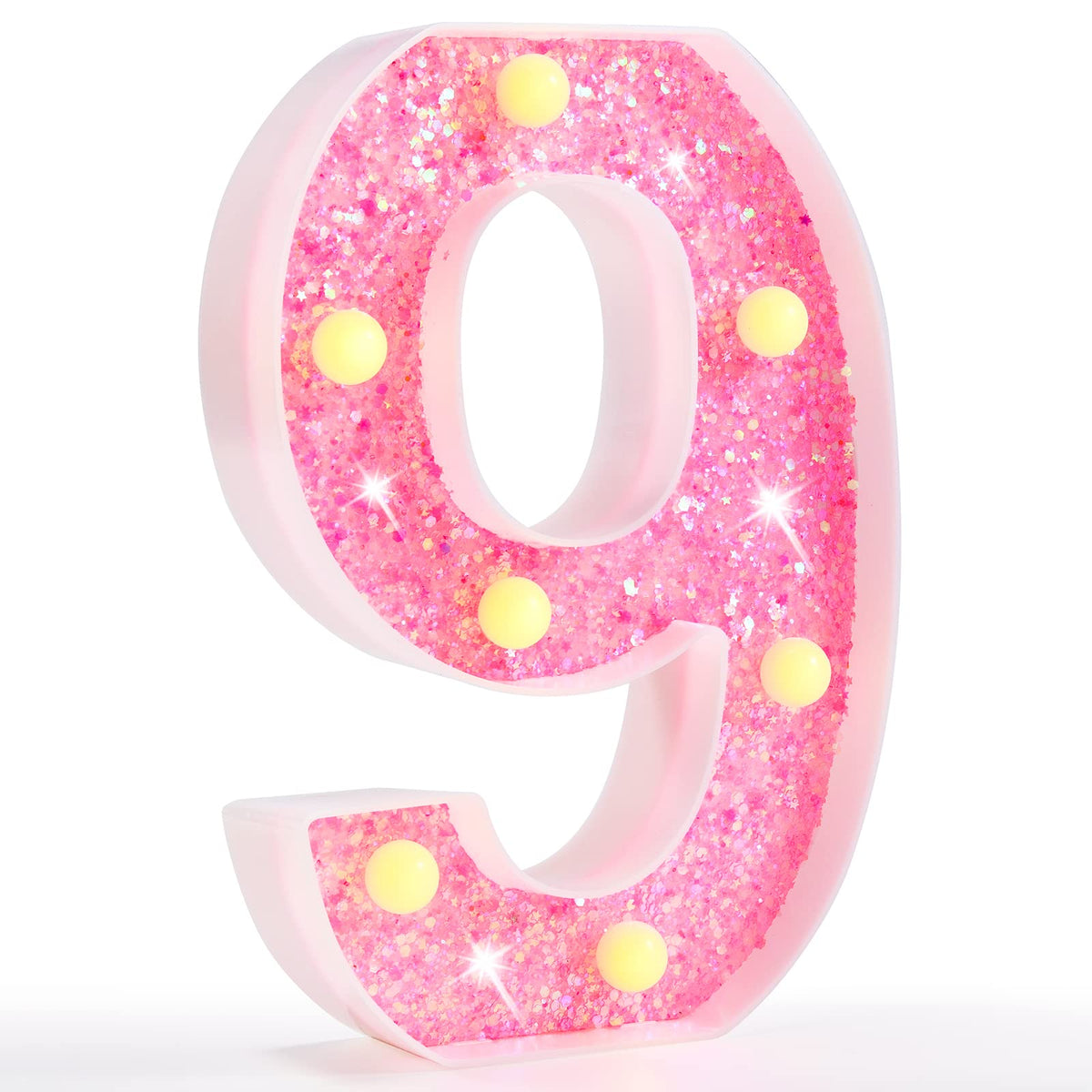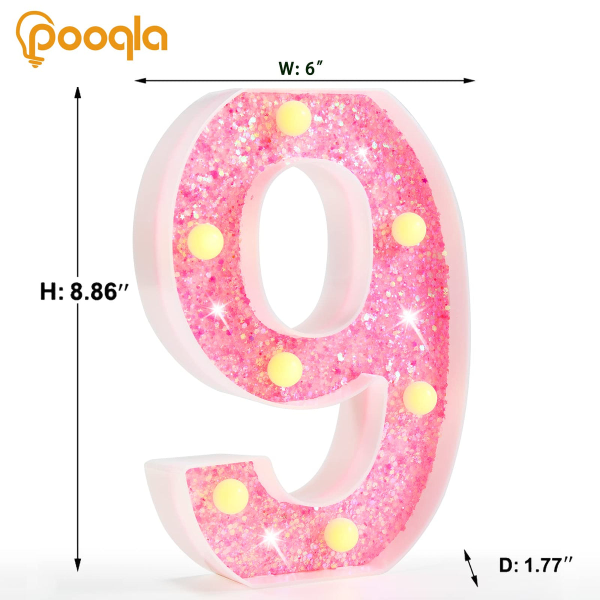 Pooqla Marquee Numbers Lights, Light Up Numbers Battery Powered, Glitter Lighted Numbers For Birthday Party, Shiny Led Numbers For Christmas Wedding Home Bar Decoration, Pink Number 9