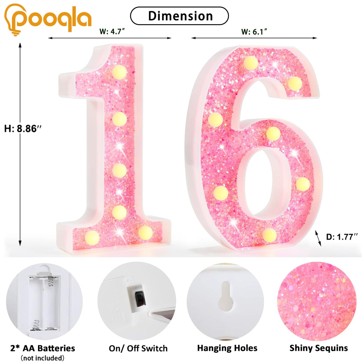 Pooqla Marquee Numbers Lights, light up Numbers Battery Powered, Glitter Lighted Numbers for Birthday Party, Shiny LED Numbers for Party for 16th 61th Birthday Anniversary Decoration, Pink Number 16