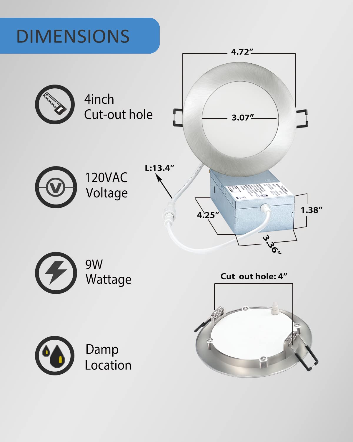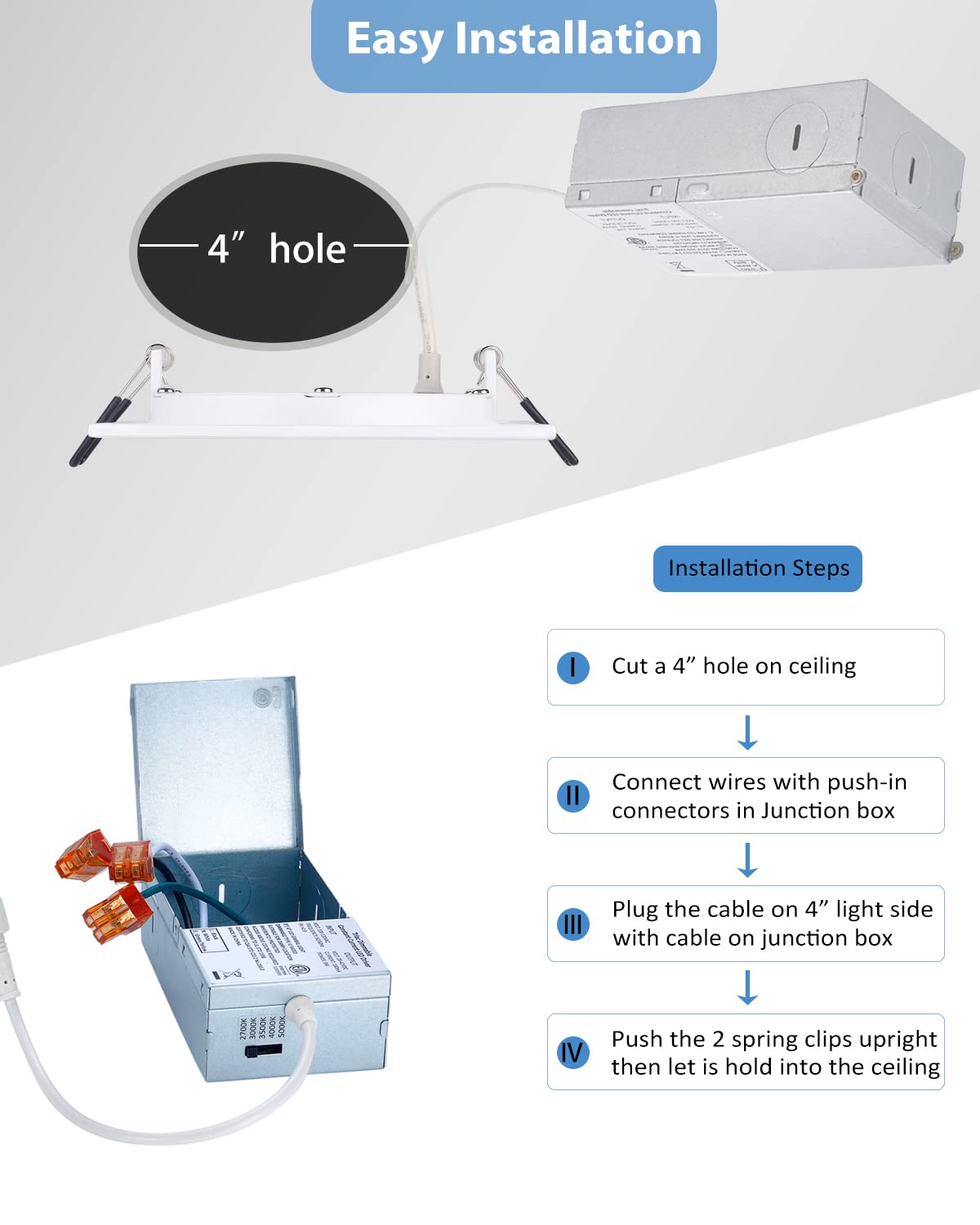 Q: How easy is it to install the POPANU recessed light?A: Installation is easy and requires just cutting a 4-inch hole in the ceiling, connecting the wires, and pushing the light into the ceiling. The two springs on the light securely hold it in place.