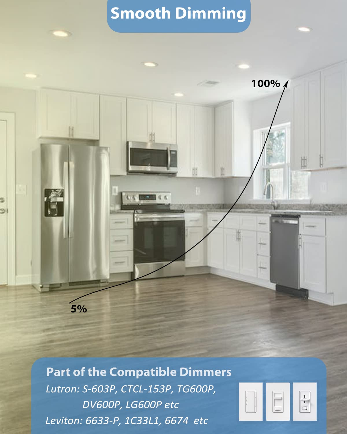 Q: What is the wattage and brightness range of the POPANU 4 inch LED recessed light?A: The POPANU 4 inch LED recessed light has a wattage of 9W and offers a smooth dimming capability with brightness adjustable from 5% to 100%, allowing you to customize the lighting according to your needs.