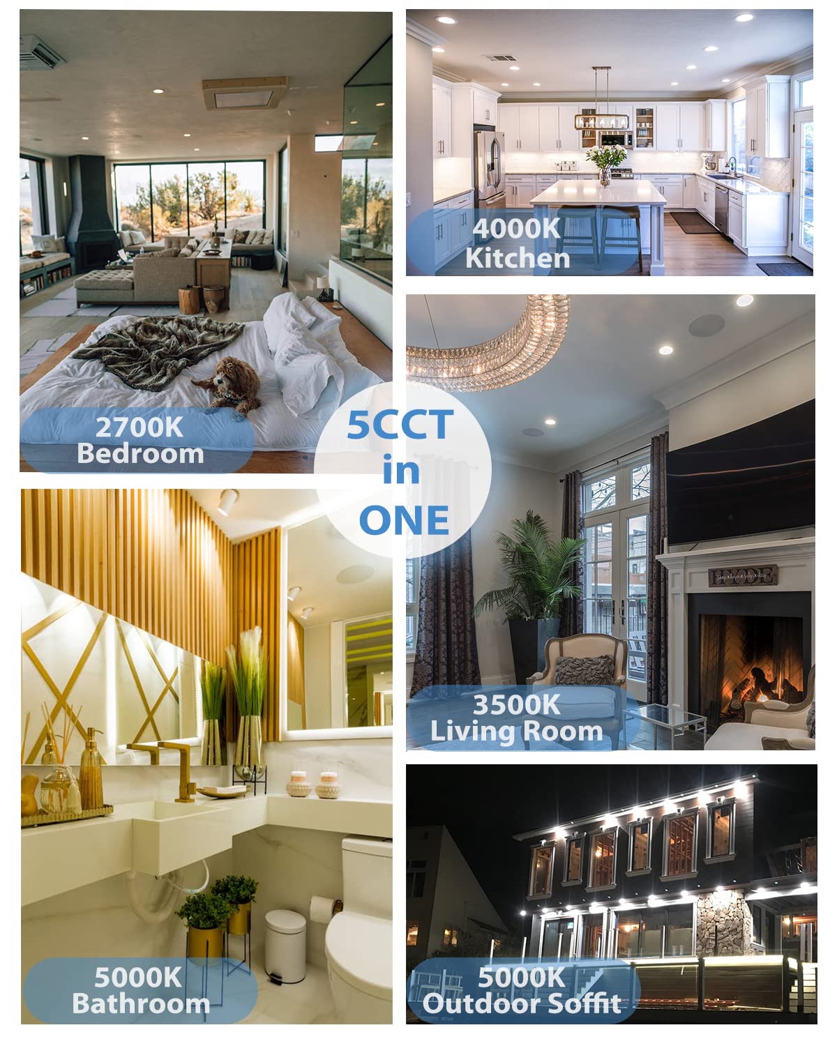 Q: What are the color temperature options available for this recessed light?A: This recessed light features five selectable color temperature options: 2700K, 3000K, 3500K, 4000K, and 5000K. You can set your preferred color temperature before installation.