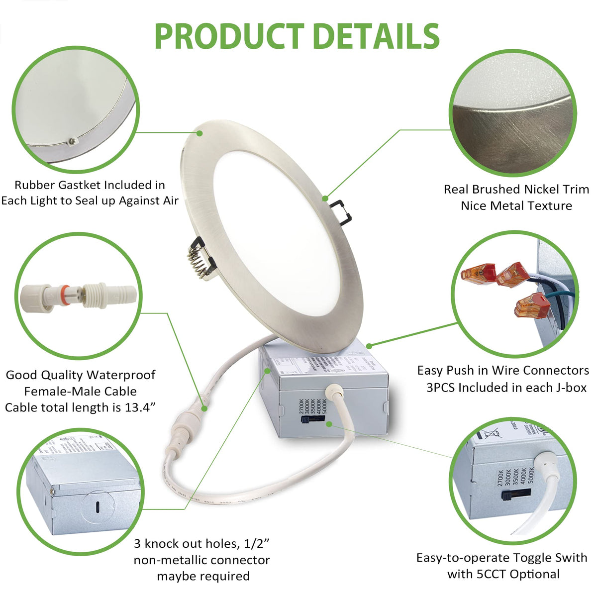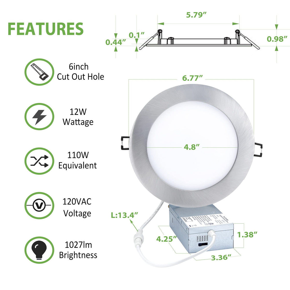 12Pack Brushed Nickel 6Inch Cut Out Hole 12W Led Recessed Downlight