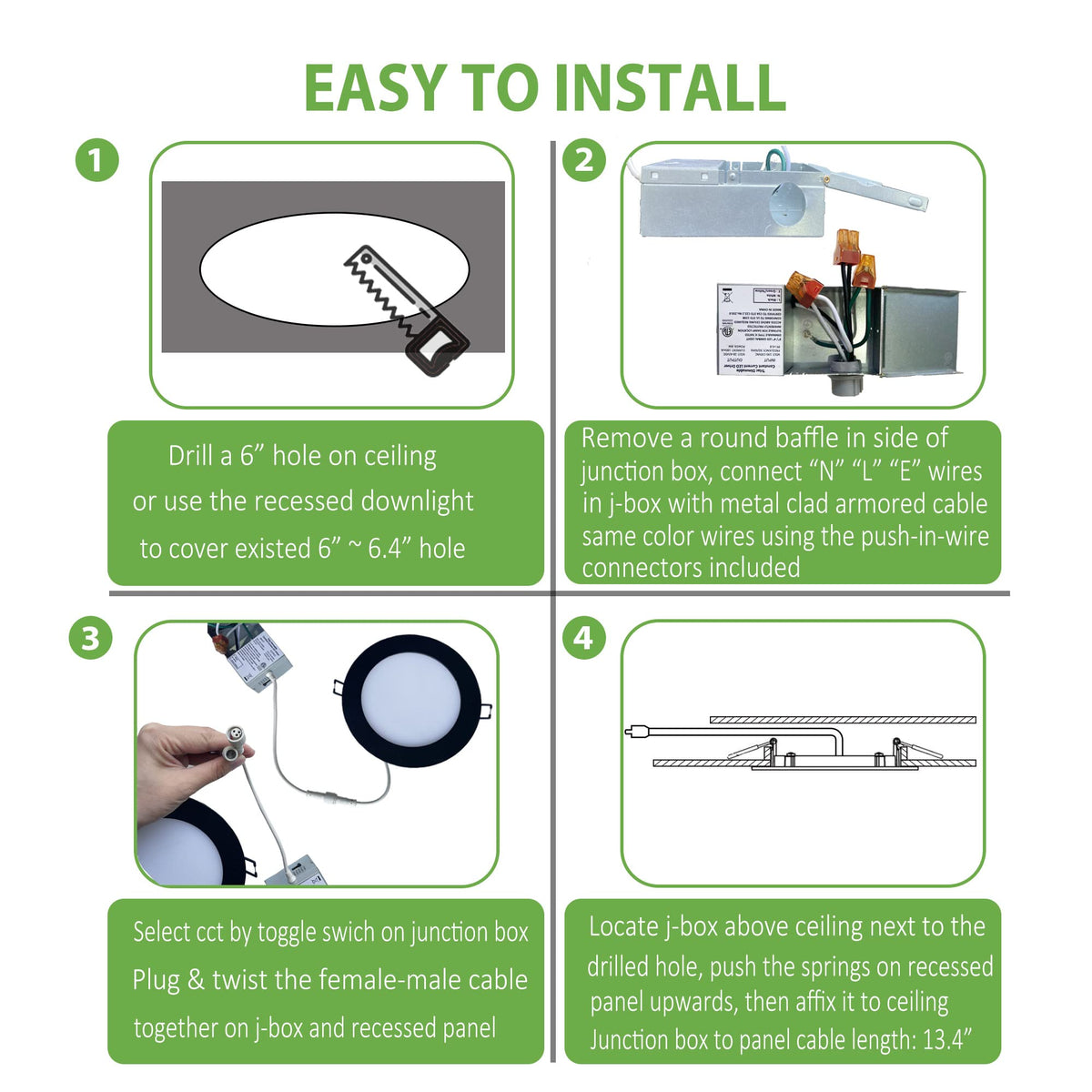 Q: How easy is it to install the 6-inch recessed lights?A: These lights are designed for quick and hassle-free installation, fitting into standard 6-inch ceiling holes, even in tight spaces or where joists are present, making them suitable for both DIY enthusiasts and professionals.