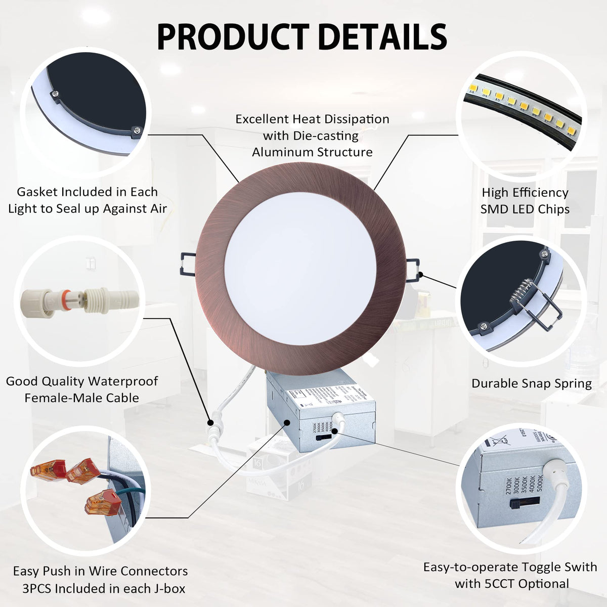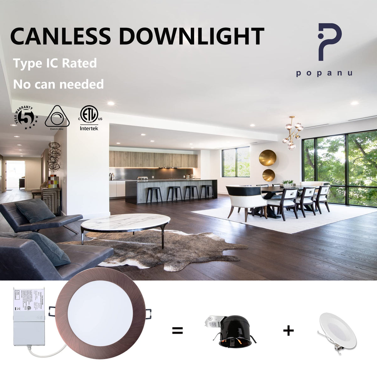 Popanu Led Canless Recessed Downlight Ultra-Thin 5 Cct Adjustable Ceilling Light With Junction Box, 12W Color Temperature Select