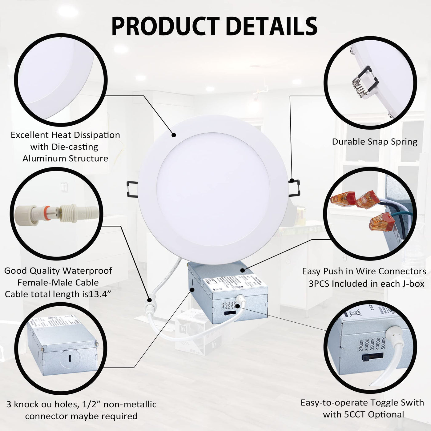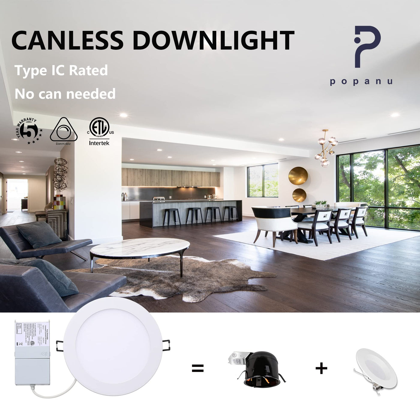 Popanu Led Canless Recessed Downlight Ultra-Thin 6 Inch 5 Cct Adjustable Ceilling Wafer Light With Junction Box, 12W Color Tempe