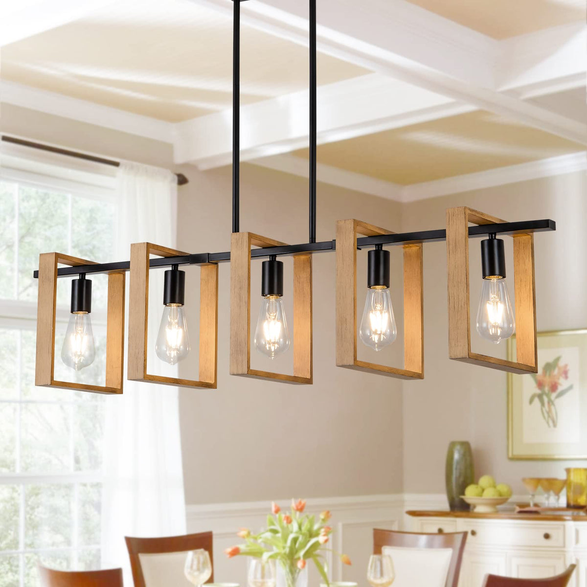 Poroulux Dining Room Chandelier Farmhouse Kitchen Island Lights Ceiling Hanging 5 Lights Wood And Black Light Fixture Rustic Pen