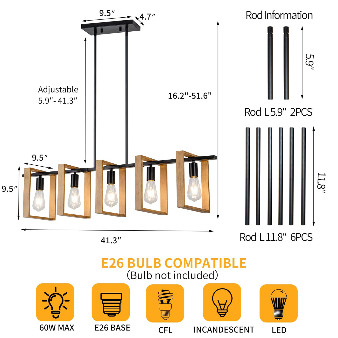 Poroulux Lighting Has Much Experiences On Foreign Market Trading And Focus On American Style Lighting For Many Years, Especially For Indoor Home Decor Light. We Can Offer Special And Unique Design, Superior Quality And Better After-Service For Our Dear Client. Hope Have A Good Start With You. Why Choose Our Island Lights From Our Store. 1.Farmhouse Chandelier With Black Metal And Wood Can Offer Comfortable And Farmhouse Feeling For Your House And Brighten Your Life 2.Pendant Lights Kitchen Island Is Made Of Iron Material With Matte Black Powder Coated And Friendly Grain Paint Wood, To Give You Higher Quality And Nice Ambience At Home 3.Adjustable Length Of Cable Or Rod For Lamps To Meet Your Requirement. 4.Full Polyfoam And Strong Carton On Package For Retro Island Light Fixture Can Be Better To Protect Your Favorite Lamp During The Transportation. 5.Rustic Light Fixtures Can Match Your Different Space, Such As Kitchen Island, Hallway,Foyer,Reception, And Work For Flat Or Sloped Ceiling. 6.Better After-Service For You We Can Offer And Reply You Within 24Hours Asap If Needed. Product Specification: Style: 5-Light, Rustic, Farmhouse, Vintage, Industrial Material:: Matte Black Iron+ Grain Paint Wood Voltage:120V 50-60Hz Bulbs: E26*5, Max 60W Bulb(Not Included).