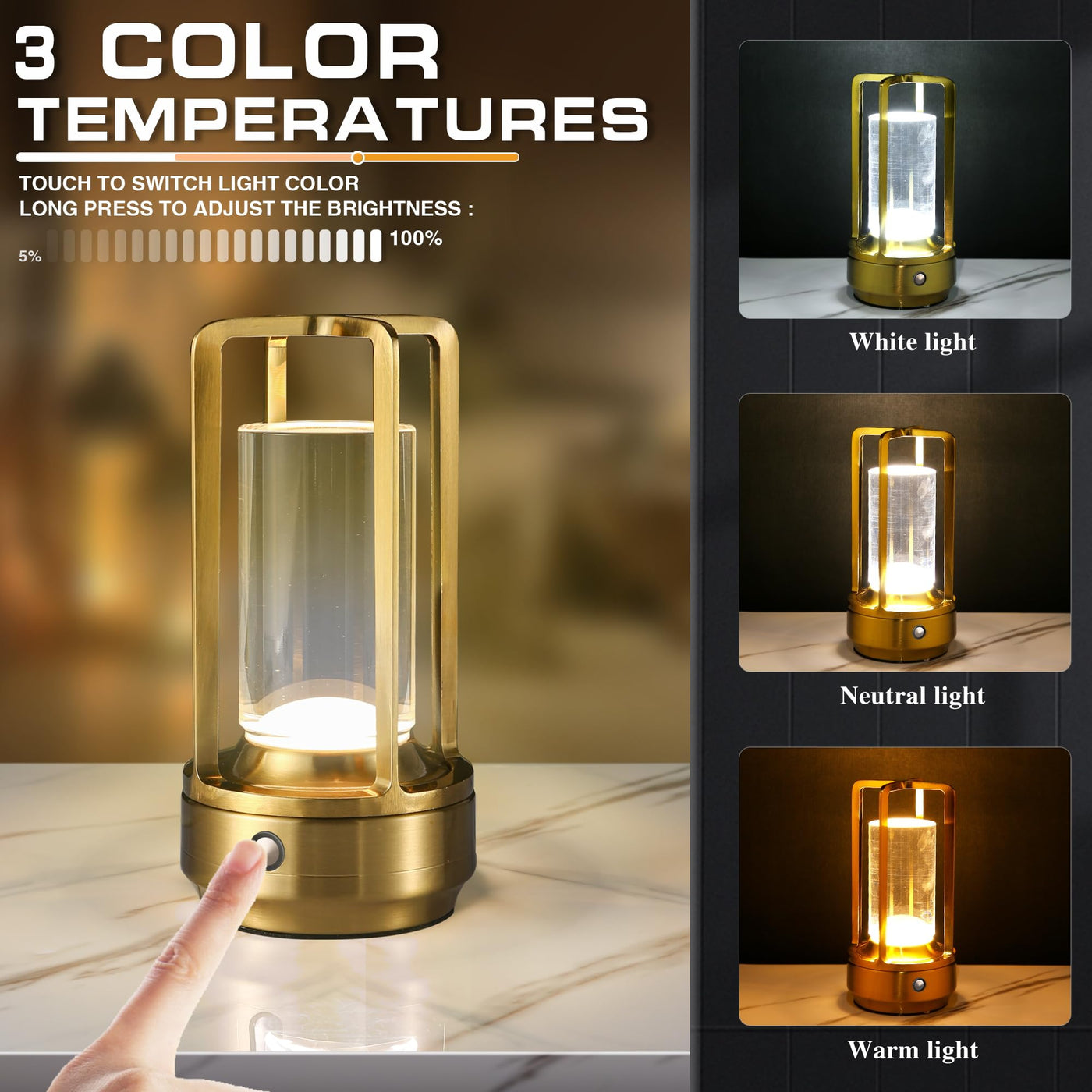 This is a wireless table lamp with rechargeable battery. It is convenient to move it around, these lights to use anywhereWe added a rustic industrial design,Warm color LED bulbs provide soft light,Sturdy and qualityconstruction Product parameters: Material: Aluminium Polished:Golden Battery capacity: 2600mAh Rated power: 3.5W Energy input: 5V=2A. Cordless lighting time: 12-40 H Charging time: 4-6 H Color Temperature: 2700-6500K Small Size: 3.5 * 7.1 inches
