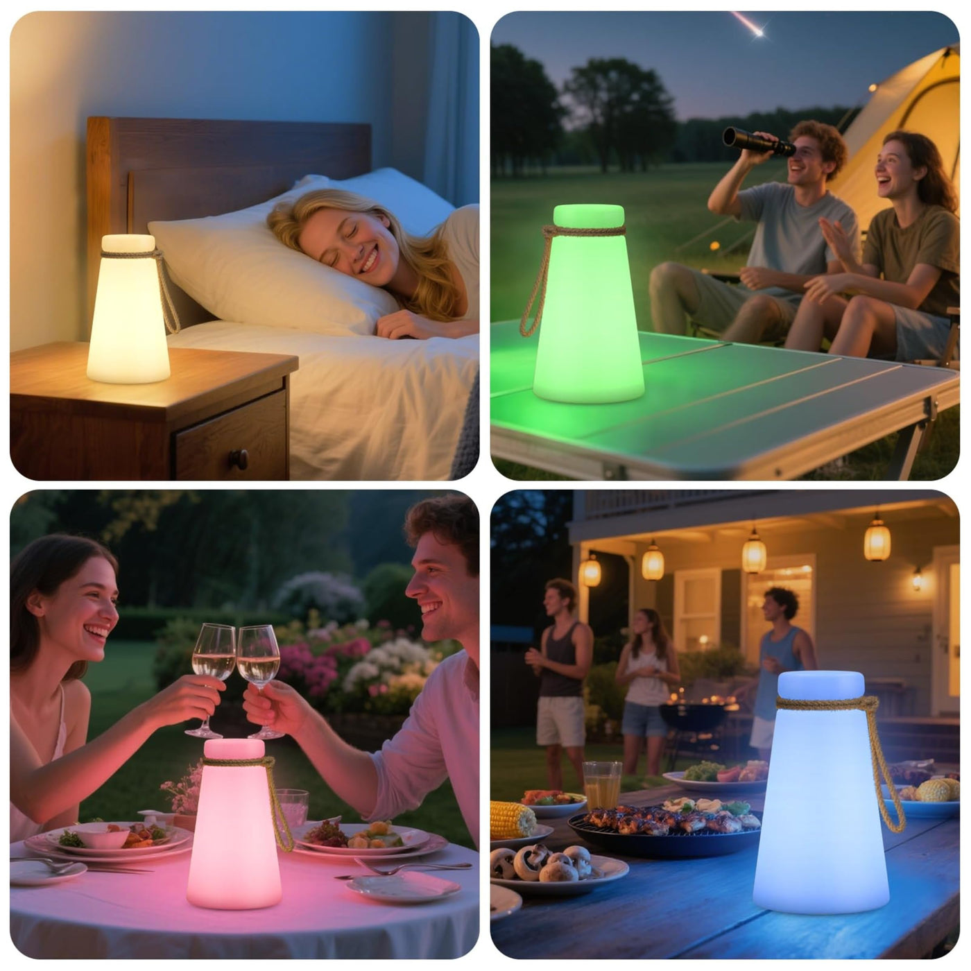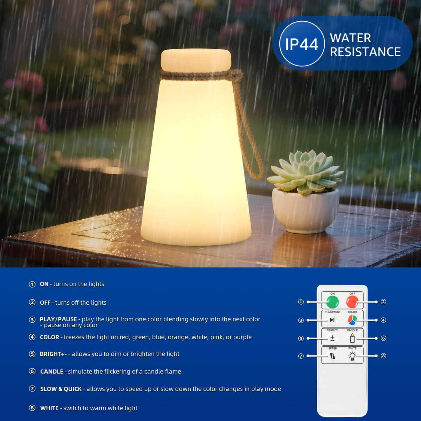 Portable Outdoor Table Lamp Cordless Rechargeable Outdoor Table Lanterns Rgb Led Lights With Remote Ip44 Water-Resistant Battery Operated Hanging Lamp For Patio Garden Camping Dining Room This Versatile Portable Outdoor Table Lamp Doubles As A Handy Cordless Lantern Suitable For Both Indoor And Outdoor Use. Whether For Patio Dinners Camping Trips Garden Gatherings Or Dining Room Ambiance It Blends Functionality With Style. Featuring 7 Vibrant Rgb Colors And Cozy Warm White Light You Can Easily Set The Mood For Any Occasion. The Included Remote Control Lets You Adjust Brightness Switch Colors Or Set Dynamic Modes From Afar Suitable As Outdoor Lamps For Evening Chats Or A Lantern To Light Up Tents. Cordless And Rechargeable This Battery-Operated Lantern Runs For Hours On A Single Charge Freeing You From Messy Cords. Its Soft Carrying Handle Adds Convenience: Hang It From Tent Hooks Carry It By Hand Or Place It On Any Surface As A Stable Table Lamp. Built With An Ip44 Water-Resistant It Stands Up To Light Rain Dew And Splashes Making It Suitable For Outdoor Use In Gardens Patios Or Camping Trips. The Sealed Design Ensures Reliable Performance In Wet Conditions While Remaining Stylish Enough For Indoor Spaces. Versatile In Use It Works As A Tabletop Lamp For Dining Rooms A Hanging Light For Gardens Or A Camping Lantern For Adventures. Portable And Easy To Use This Rechargeable Table Lamp And Lantern Adapts To Every Lighting Need-Indoors Outdoors And Everywhere In Between.