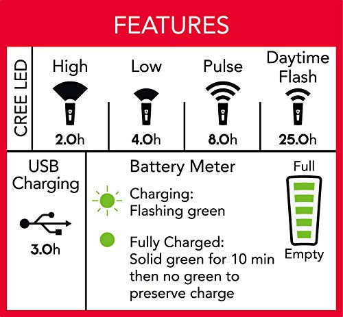 The all new pathfinder USB headlight is unlike any other bike light on the market with three new technologies to help you see and be seen while riding, day or night. The vertical cutoff beam is designed to focus light from the main beam onto the road in front of you and prevents lost lumens that can blind oncoming traffic. For daytime riding, the daytime running flash is bright enough to make you seen even on the brightest days. The battery meter lets you know exactly how much battery life you have left before needing to recharge with the included USB cord. The pathfinder includes a powerful lithium-ion battery and a darkness destroying Cree LED bulb. It provides superior luminous guidance for up to 25 hours of ride time. The rugged construction is weatherproof and strong enough to handle the abuse of an urban commute.