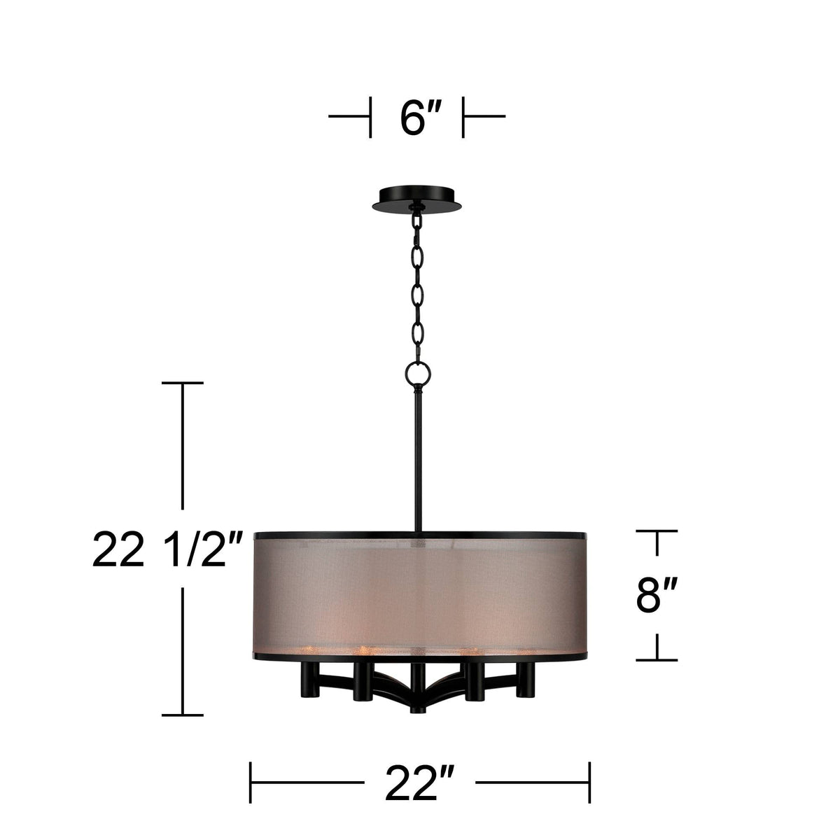 Q: What is the size of the Possini Euro Design Caliari Black Drum Pendant Chandelier?A: The chandelier measures 22 1/2 inches high and 22 inches wide, making it a perfect fit for various room sizes.