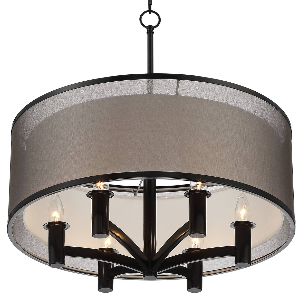Q: What materials are used in the construction of the chandelier?A: The Possini Euro Design Caliari chandelier features a high-quality metal construction with a stylish black finish and a double shade design, consisting of a black outer shade and a white inner shade.