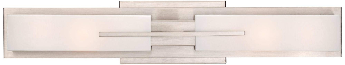 Add a comforting contemporary look to your bath or vanity area with this white glass and satin nickel bath bar light fixture from the Possini Euro Design Midtown collection. Attractive and versatile transitional style wall fixture can be mounted vertically as shown, or horizontally. Add one to each side of a bathroom mirror on the vertical, or hang horizontally above the mirror. This chic light looks great in any direction.