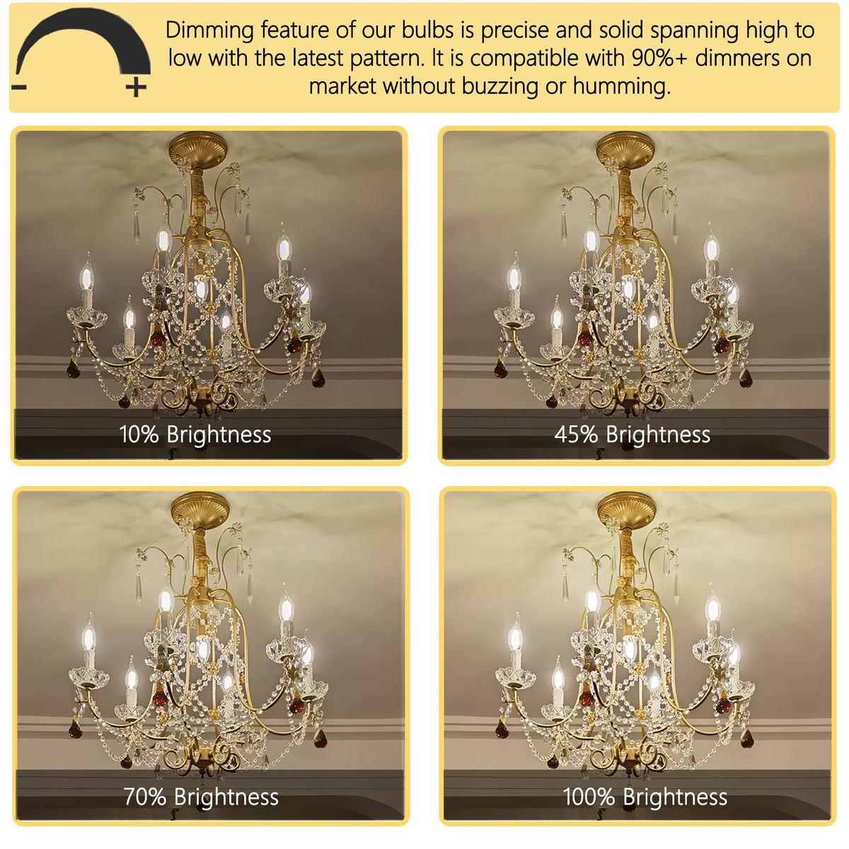 Q: Are these light bulbs dimmable?A: Yes, the Potanro vintage candle bulbs are dimmable, allowing you to adjust the brightness to suit various environments and lighting needs.