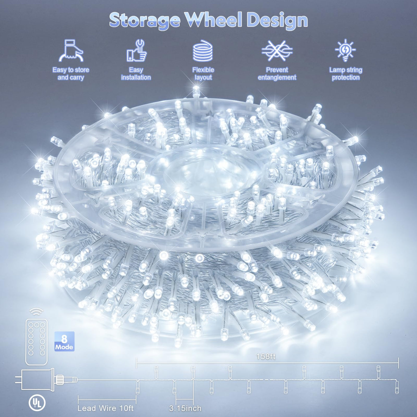 Q: How do I store the Christmas lights after use?A: The lights feature a practical storage wheel design, making it easy to organize and store them efficiently after the holiday season or celebrations.