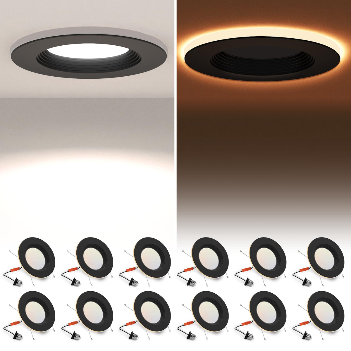 12 Pack Black 5/6 Inch Led Can Lights With Night Light, 5Cct Retrofit Recessed Lighting Selectable 2700K-6000K Dimmable, 12W=75W, 1200Lm Downlight With Metal Smooth Trim-Etl And Energy Star