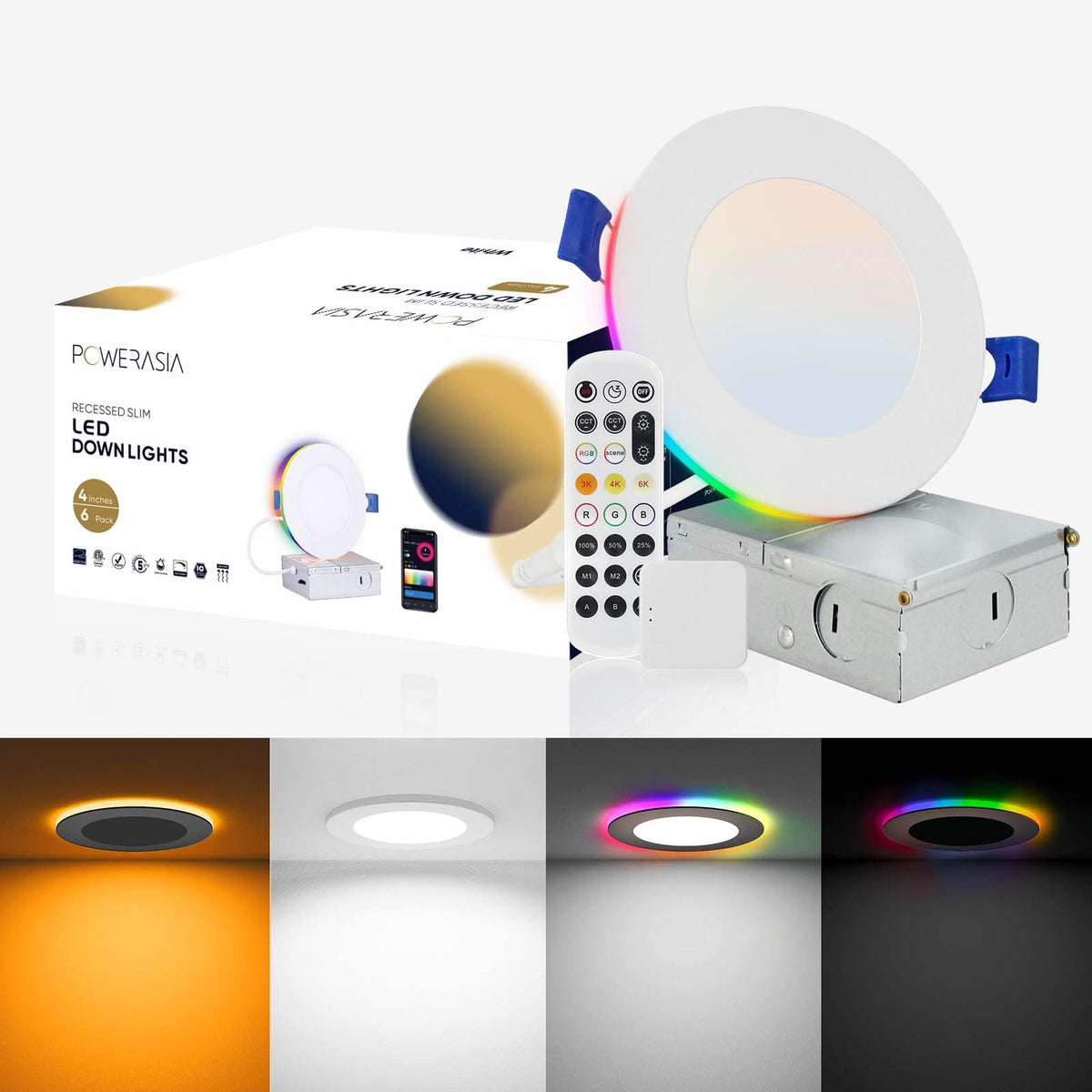 Powerasia 6 Pack 4 Inch Smart Led Recessed Lighting With Rgb Back Light, 9W 850Lm Smart Led Recessed Lights With Junction Box, 2