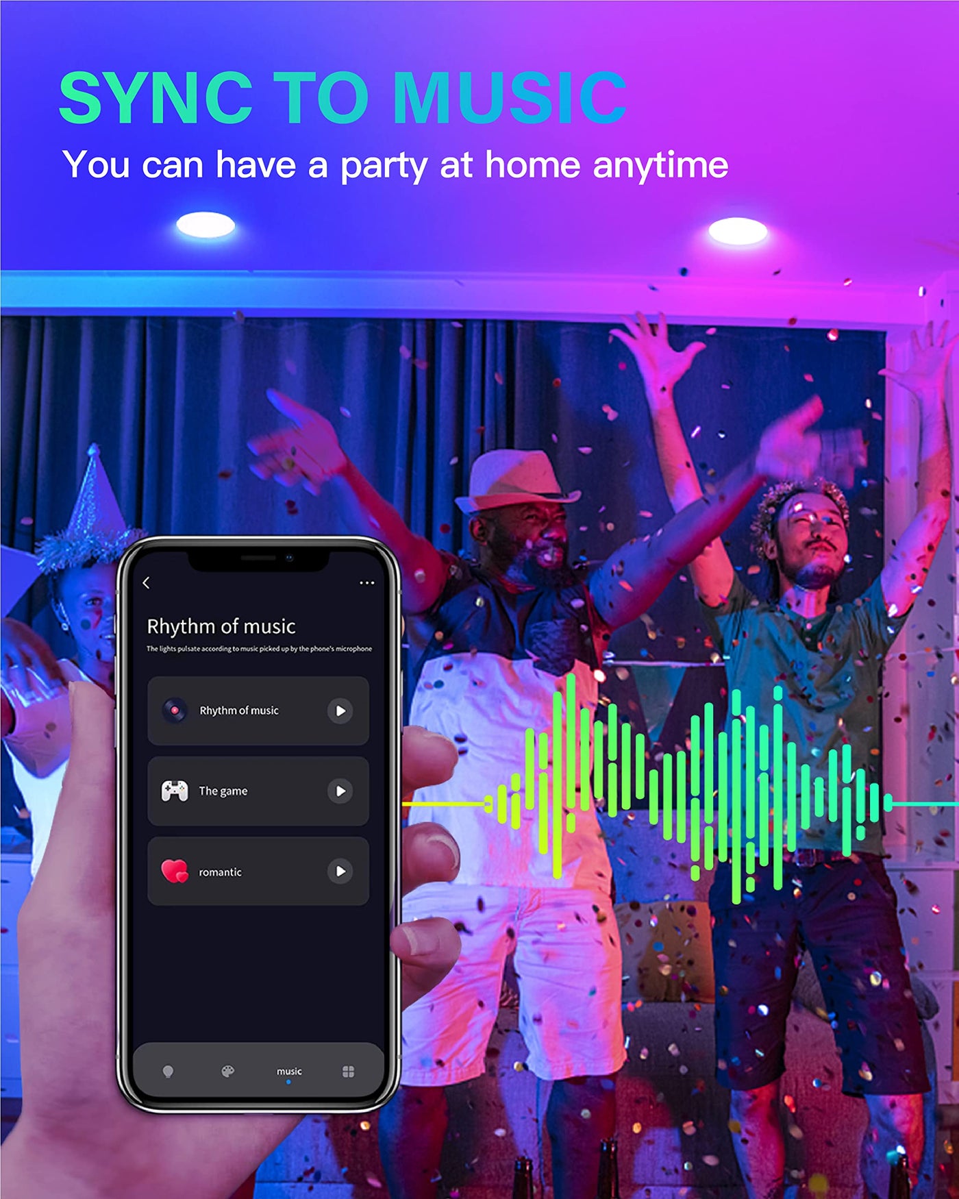 Music & Mic Sync: Sync the lights to music beats for an immersive party experience, creating an engaging atmosphere at home.