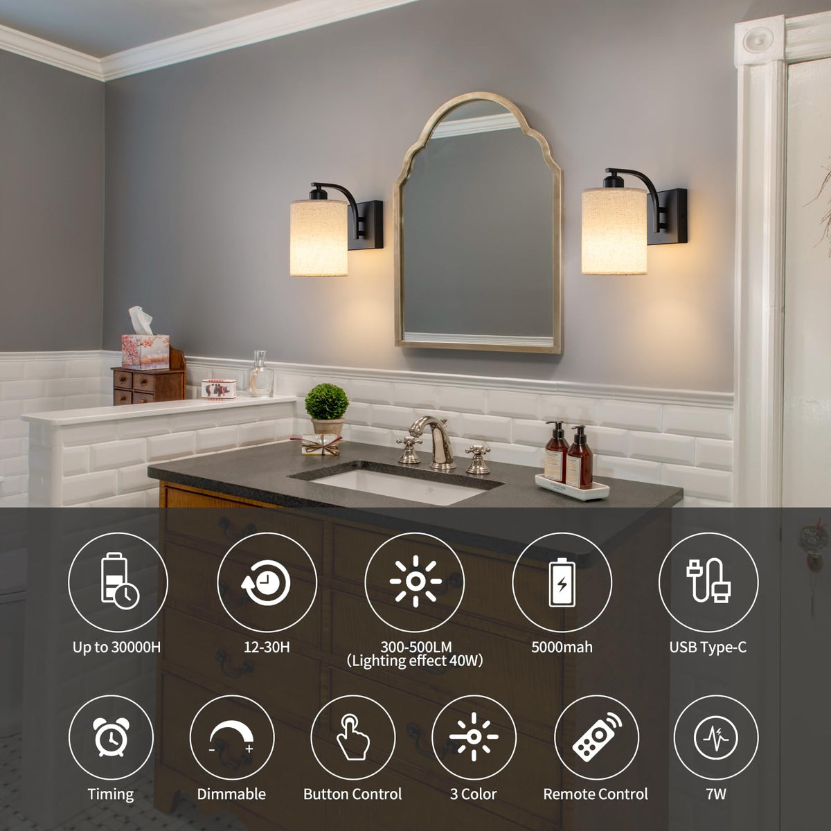 Powfloven Black Rechargeable Battery Operated Wall Sconces Set of 2 with Remote, Wireless Dimmable Battery Powered LED Wall Lights, Cordless Wall Lighting Lamp Fixture For Bedroom Living Room Wall sconce set X2 Light Bulbs X2 Remote X2 Installation Instruction X2