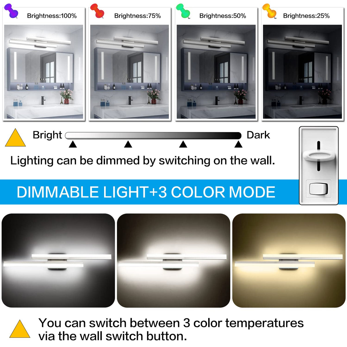 3 Color Changeable Vanity light, Dimmable brightness adjustable and warm white/neutral white/cold white temperature to meet your mood (3000k/4500k/6000k Color Optional).