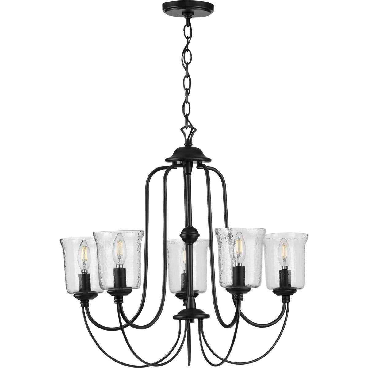 Beautiful lighting will appeal to both your classic taste and your artistic spirit with this chandelier. Wandering eyes will focus on clear, chiseled glass shades as they offer an air of refinery. Handsome light bases with dainty, sophisticated curved arms support elegant light bases. The frame is coated in a classic black finish to complete the versatile, eye-catching design.