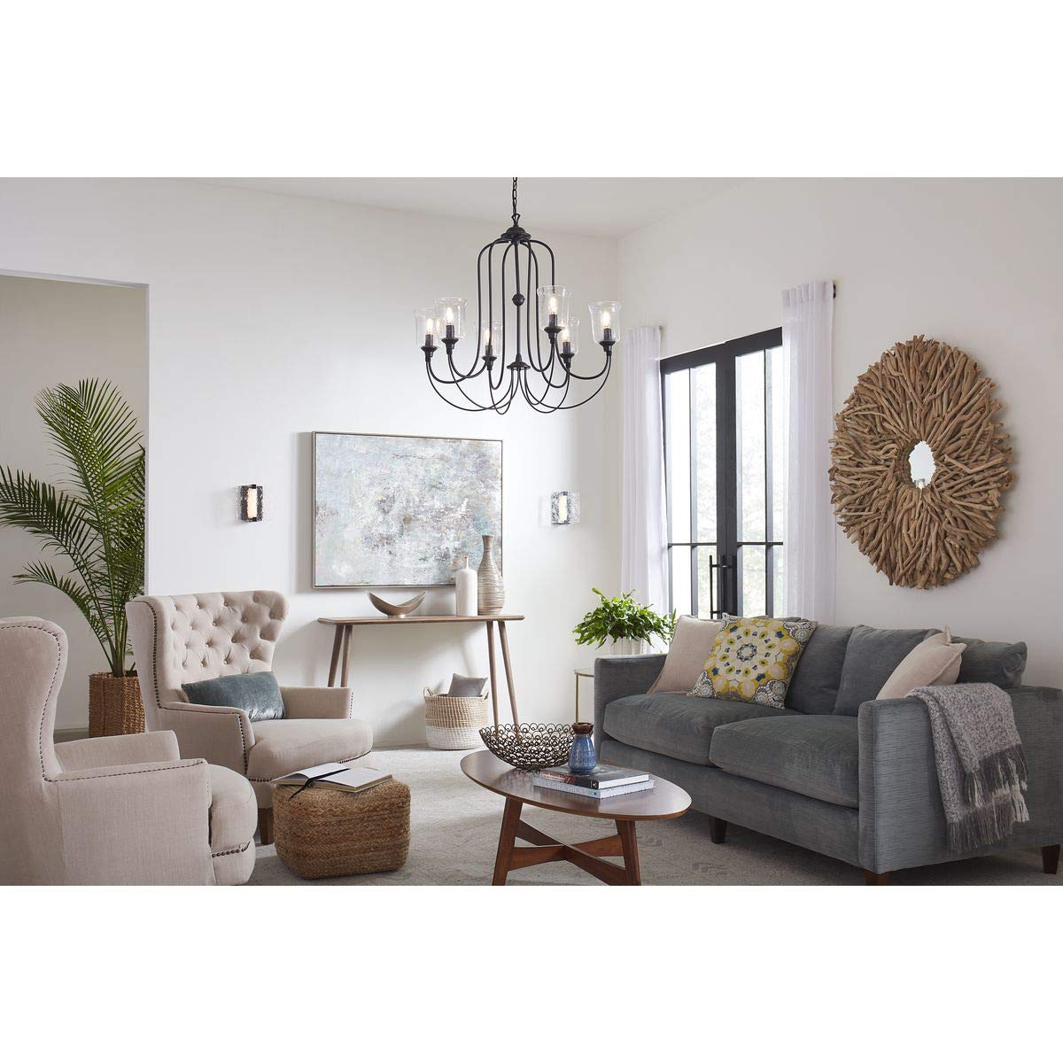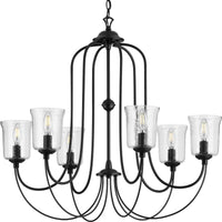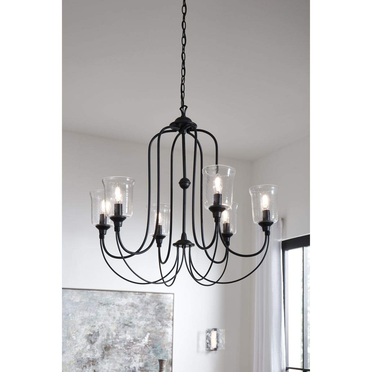Beautiful lighting will appeal to both your classic taste and your artistic spirit with the Bowman Collection Six Light Black Chandelier. Wandering eyes will focus on the clear, chiseled glass shade that encircles four elegant light sources gathering quietly at the light fixture's center. Handsome, black light bases with sophisticated curved arms originate from a decorative black knob that embellishes the outer bottom of the textured glass shade.