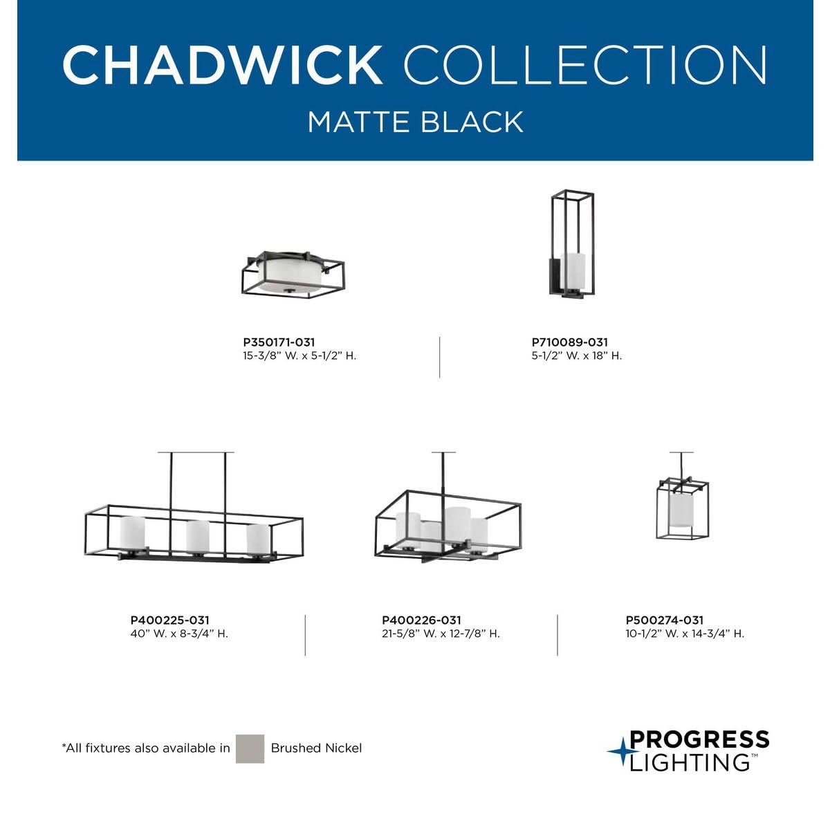 Stick with simple geometric forms and clean crisp lines with the modern Chadwick Collection's Three-Light Matte Black Island Chandelier. A beautiful etched opal glass shade visually calms the sharp edges of the boxy frame in a masterful stroke of design excellence. The frame is coated in a matte black finish that visually contrasts with the light shade. The light fixture is just right for spaces in need of a subtle, feminine touch.