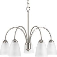 Five-light chandelier from Gather possesses a smart simplicity to complement today's home. Brushed Nickel metal arms descend downwards and curve sharply to prop white etched glass shades. Etched glass add distinction and provide pleasing illumination to your room. Coordinating fixtures from this collection let you decorate an entire home with confidence and style.