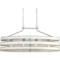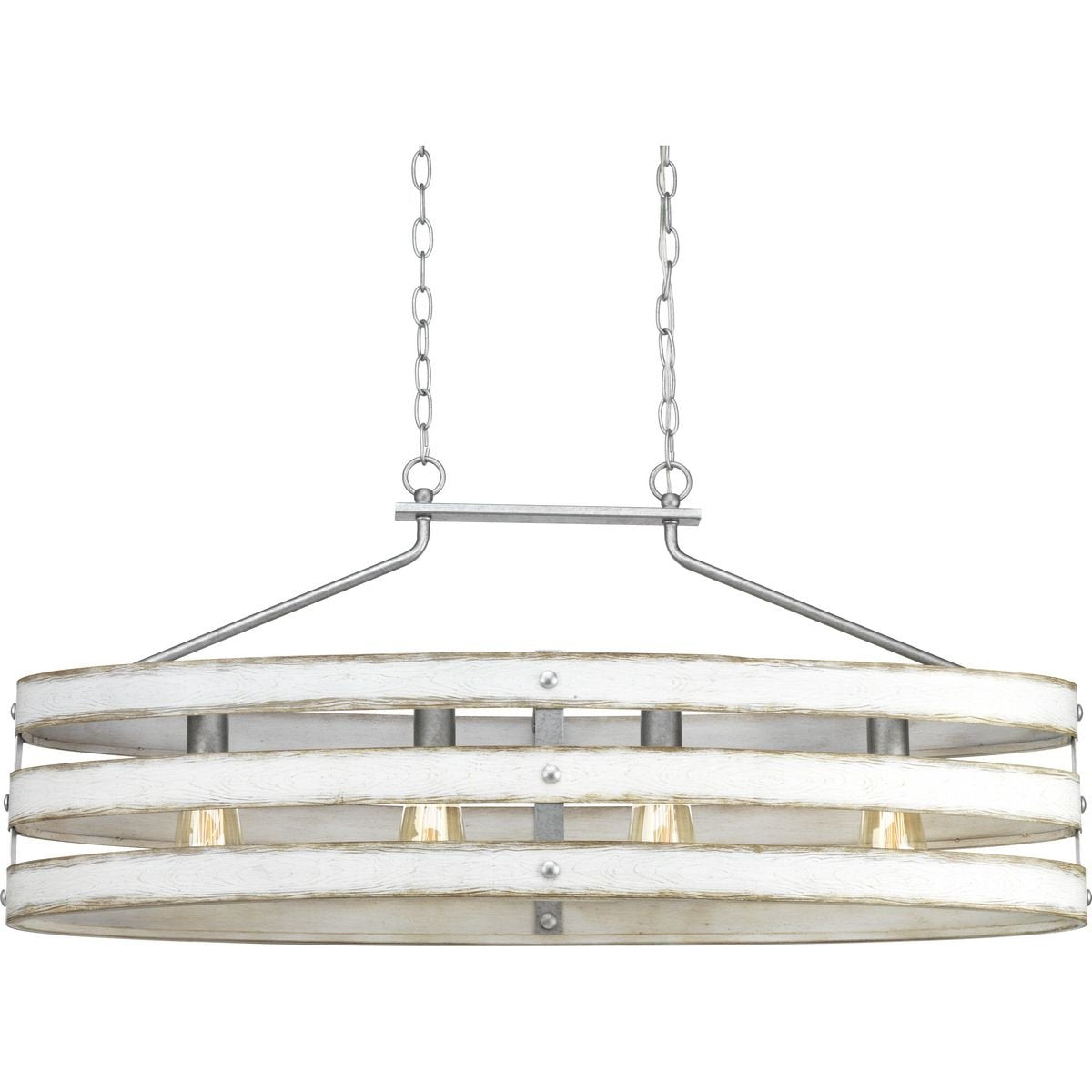 Select the perfect farmhouse home d cor with the Gulliver Collections Four-Light Linear Chandelier. Bask under the cozy country glow of the light bases arranged in linear fashion at the light fixtures center ready to hold generous light sources. Three circular bands wrap together to create an open-design similar to rustic country baskets. The frame features a dual-toned color combination of galvanized with antique white accents. For ideal illumination, the linear chandelier uses four medium base bulbs that are sold separately (75w max - LED, CFL, halogen, or incandescent). Incorporate clear light bulbs for a pinch of contemporary shine or opt for vintage bulbs to enhance the light fixtures antique demeanor. With the ability to be fully dimmable with dimmable bulbs, the light fixture offers endless versatility when it comes to finding a place in your home d cor vision. The light fixtures organic farmhouse look is ideal for any hallway, foyer, great room, or dining room in farmhouse, urban industrial, or coastal setting. Its time to breathe new life into the mundane every day with timeless and truly transformative bathroom lighting. Make your purchase today to begin your journey to a whole new lighting experience. Progress Lighting products are designed for exceptional quality, reliability, and functionality.