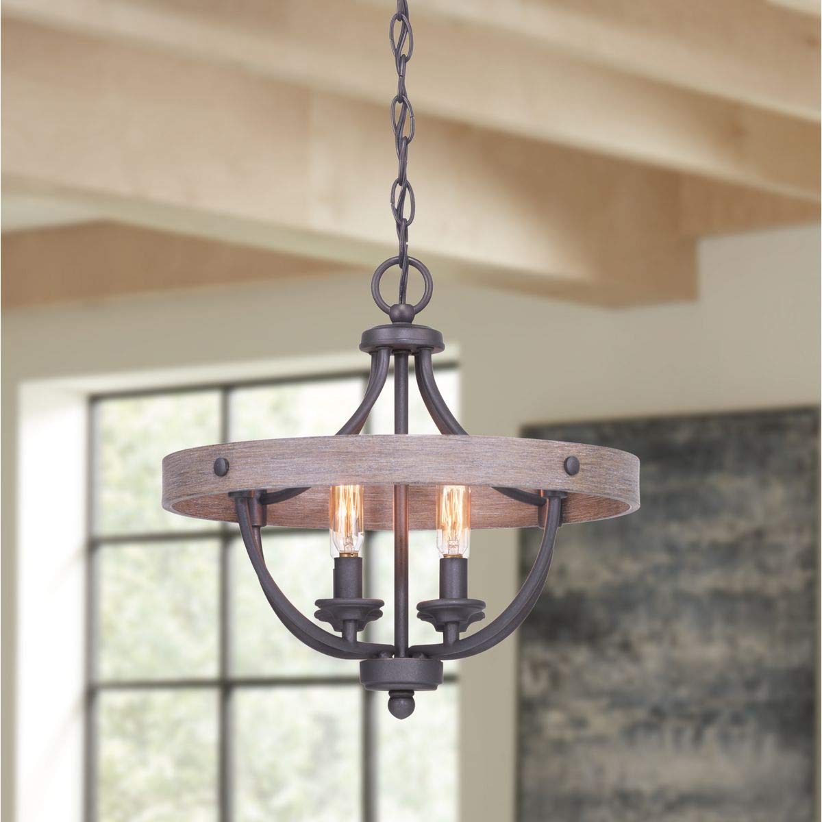 Crafted from durable alloy steel, this fixture features a charming open-frame design that allows light sources to nestle within, creating a beautiful illumination effect. The dual-tone frame, which includes a weathered gray driftwood faux wood band wrapped around graphite arms, adds a rustic character that complements coastal, farmhouse, rustic, or urban industrial decor styles. This light fixture is compatible with dimmable bulbs and is ideal for vintage filament bulbs, allowing you to customize the ambiance of your space.