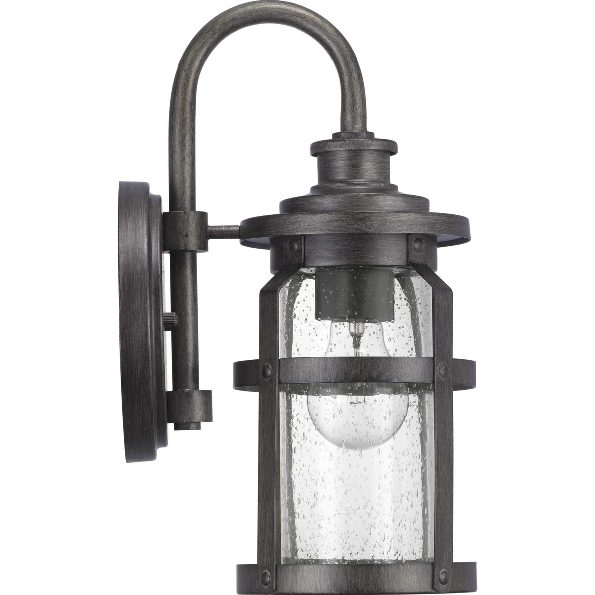 The one-light small wall lantern in the Haslett Collection features a design with intersecting linear details that surrounds clear seeded glass and finished in Antique Pewter. Coastal-inspired frame is suitable to complement architecture with Farmhouse flair.