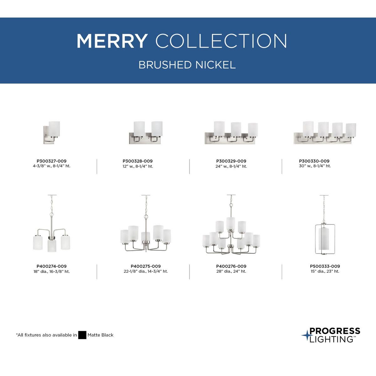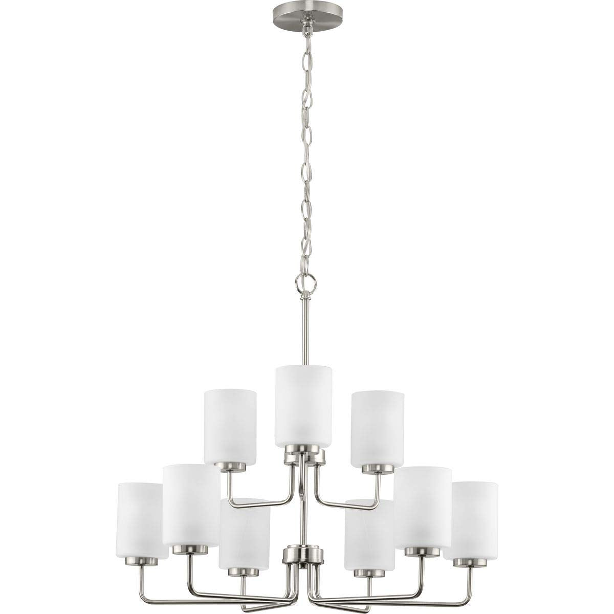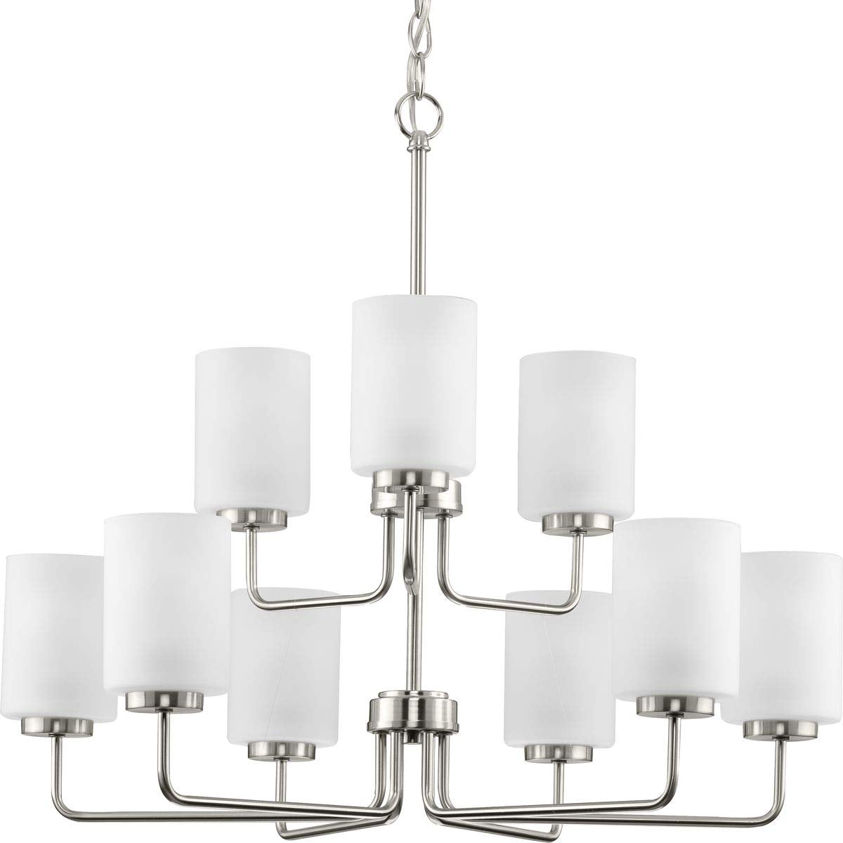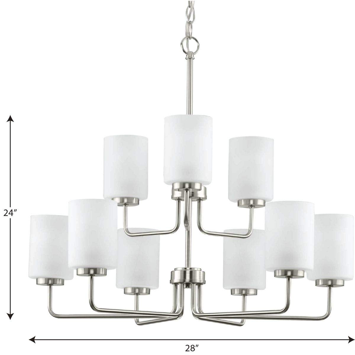 Bring a modern vibe to any room with the Merry Collection 9-Light Brushed Nickel Etched Glass Transitional Chandelier Light. The clean-lined frame, tubular arms, and round light bases are coated in silver brushed nickel finish. Light sources glow from inside crisp etched glass shades.