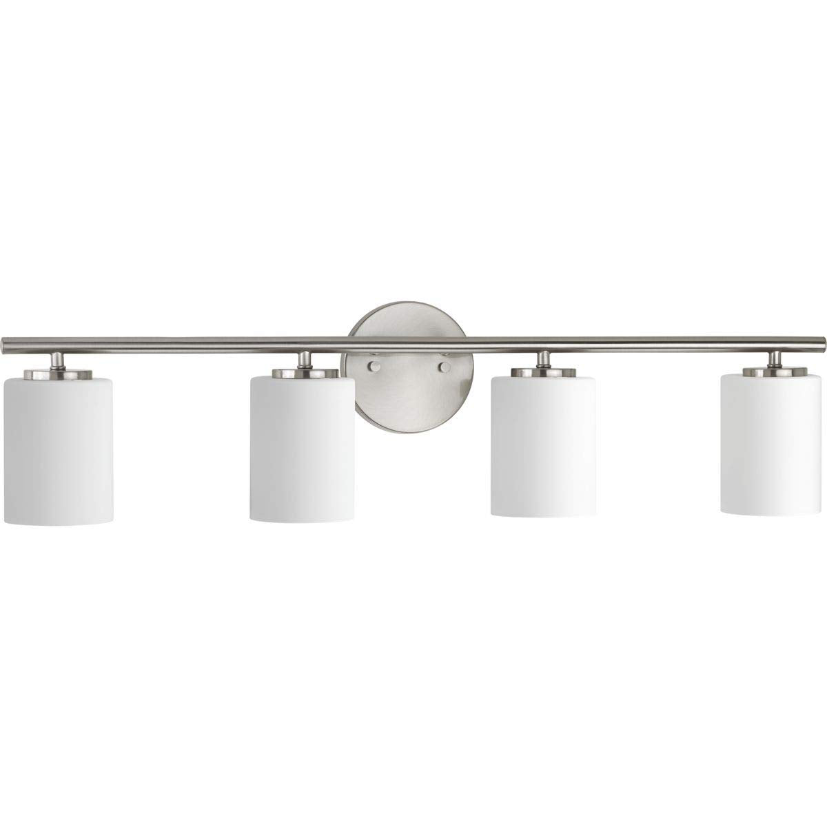 Fall in love with a lighting experience that epitomizes relaxed elegance by mingling functional design with subtle, sophisticated forms with the Replay collections modern four-light bath and vanity bracket. A smooth, circular backplate coated in an understated brushed nickel finish sets a tone of refined aesthetic taste. Smooth, round bars conjoin at crisp right angles to hold small, circular light bases that further accentuate the fixtures stylishly simple demeanor. Crisp, cylindrical etched glass shades elegantly rest on the metal light bases as they exude a quiet confidence ready to illuminate any tired mind or body in need of a restorative glow. For optimal illumination, the bath bracket uses four medium base bulbs that are sold separately (100w max - LED, CFL, halogen, or incandescent). With the ability to be fully dimmable with dimmable bulbs and having the approval to be installed in damp locations, the light fixture offers endless versatility when it comes to finding a place in your home d cor vision. The bath brackets air of simple sophistication is ideal for any bath and vanity setting in coastal, luxury, modern, and transitional interiors. Mount the bath bracket facing up or down, around or over a bathroom mirror to banish shadows from your face while getting ready for the day or an evening out. Its time to breathe new life into the mundane every day with timeless and truly transformative bathroom lighting. Make your purchase today to begin your journey to a whole new lighting experience. Progress Lighting products are designed for exceptional quality, reliability, and functionality.