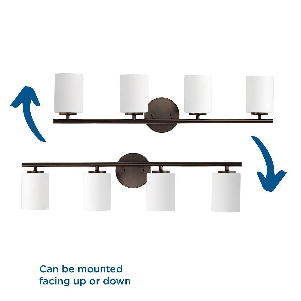 Four-light bath & vanity from the Replay Collection, smooth forms, linear details and a pleasingly elegant frame enhance a simplified modern look. Fixture can be mounted up or down. Antique Bronze finish.