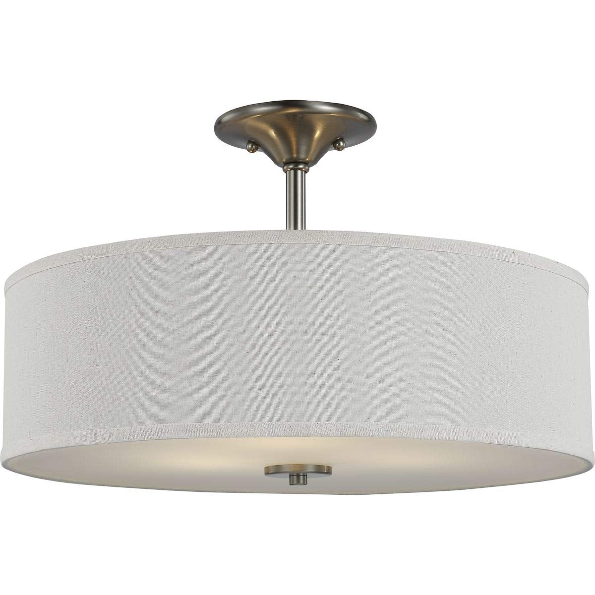 Harkening back to a simpler time, the Inspire Collection Brushed Nickel Three-Light Semi-Flush Mount's timeless demeanor is sure to become a favorite for generations. A round, off-white linen shade with an etched glass diffuser steals the show and creates a beautiful muted glow. Understated metal accents complement the light fixture as it fosters a casual, friendly atmosphere.