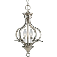 Product DescriptionTwo-light foyer fixture featuring soft angles, curving lines. Gracefully exotic, the Trinity Collection offers classic sophistication for transitional interiors. Sculptural forms of metal are enhanced by a classic finish. This transitional style can transform a room or your whole home with its charming versatility. Brushed Nickel finish.From the ManufacturerGracefully exotic, the Trinity Collection offers classic sophistication for transitional interiors. Sweeping, minimalist forms are enhanced by a striking brushed metal finish. Two-Light foyer fixture. Uses (2) 60-Watt candelabra bulbs 12-Inch Diameter by 18-Inch Height